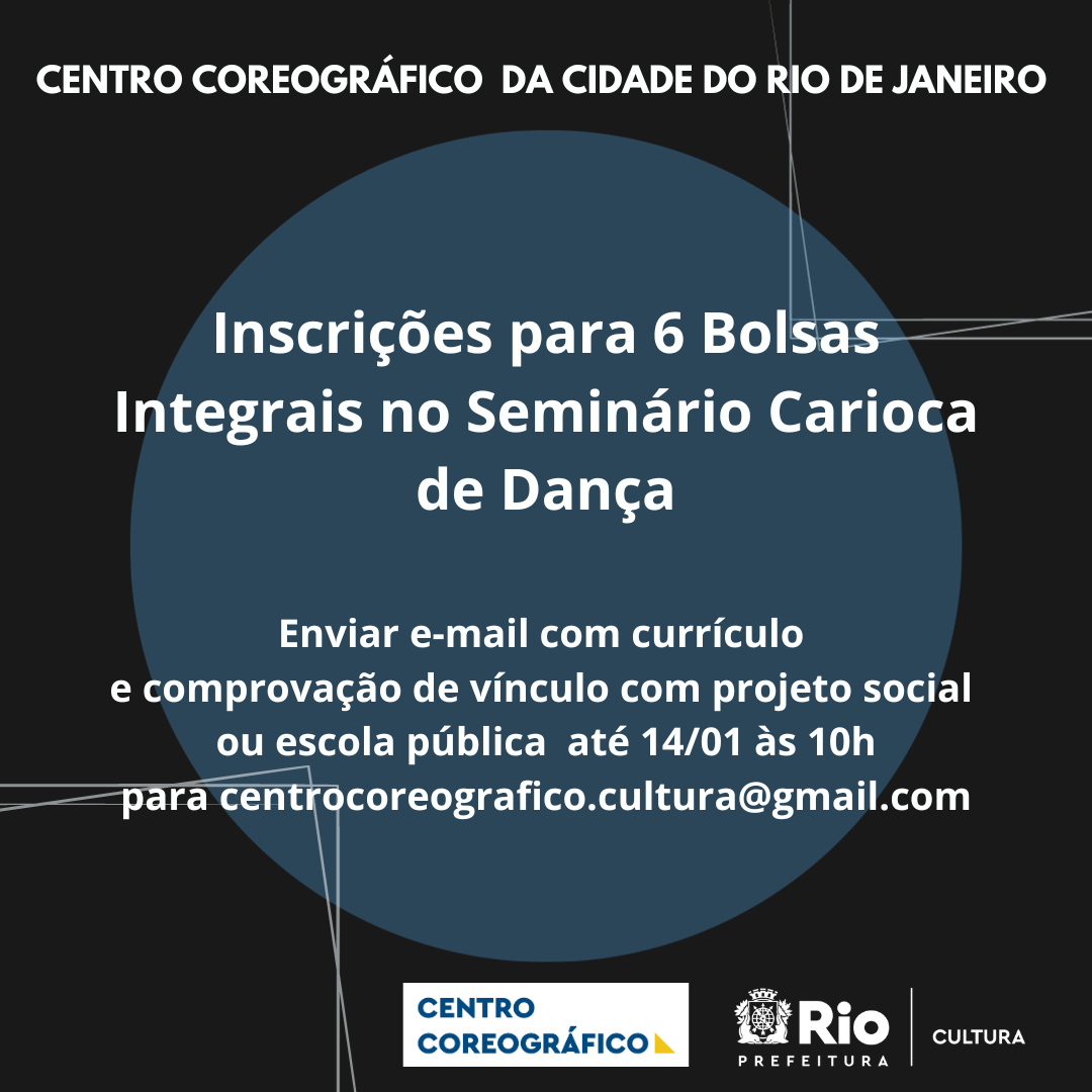O Centro Coreográfico disponibilizará 6 bolsas integrais para o Seminário Carioca de Dança, sendo 3 bolsas para alunos e 3 para professores. Os interessados deverão enviar currículo e comprovação de vínculo com algum projeto social ou escola pública para o e-mail centrocoreografico.cultura@gmail.com até domingo dia 14/01 às 10h.