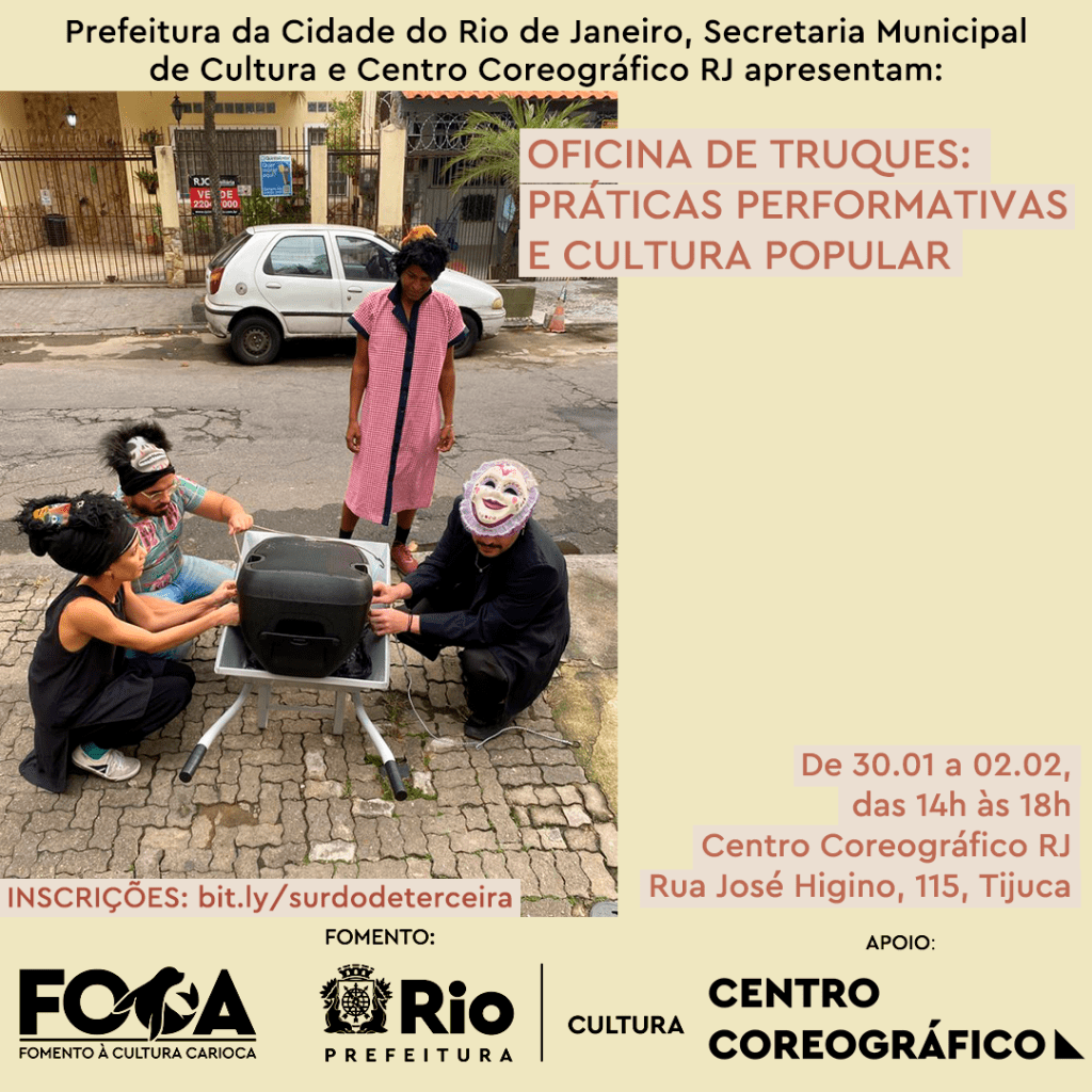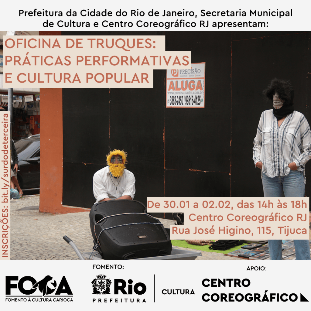 Resumo: Esta oficina teórico-prática é parte do projeto Surdo de Terceira: uma performance sonora em Vila Isabel, selecionado pelo edital FOCA 2022. Ao longo de quatro encontros, com quatro horas de duração cada, tentaremos propor convergências entre a arte da performance e diferentes manifestações da cultura popular, como os bate-bolas. A partir de experimentações com o corpo, com a palavra e com o som, queremos mobilizar questões como: quem diz o que é cultura popular? Que atenção o poder público destinou historicamente a manifestações como os bate-bolas, o samba e o funk? A cultura popular pode ser instrumento de resistência política?