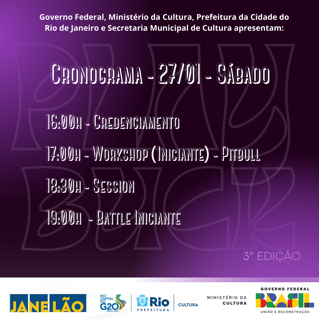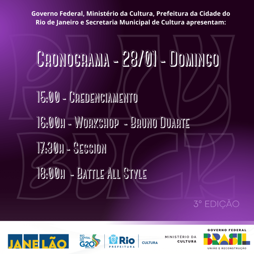 Informações: Sábado toda a programação será voltada para o público iniciante, com a aula e a batalha voltado para esse foco. Domingo toda a programação será voltada para o público intermediário/ avançado, com a aula e batalha voltada para esse foco.