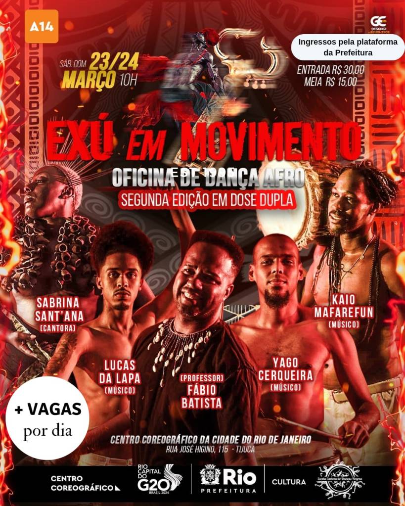Resumo: A oficina visa introduzir os movimentos do Orixá Exú, através do método de aprendizagem e troca da Escola Carioca de Danças Negras. No ano em que completa 10 anos de trabalho e pesquisa, a Escola Carioca de Danças Negra se consolidou no cenário brasileiro uma importante entidade de desenvolvimento de técnicas das danças negras. Exú é orixá dos caminhos, da decodificação das linguagens, mensageiro, o primeiro Orixá do Xirê. É uma oficina que vai reverenciar em dança as múltiplas qualidades deste arquétipo. A oficina contará com percussionistas e uma cantora, além do professor de Dança Fabio Batista.