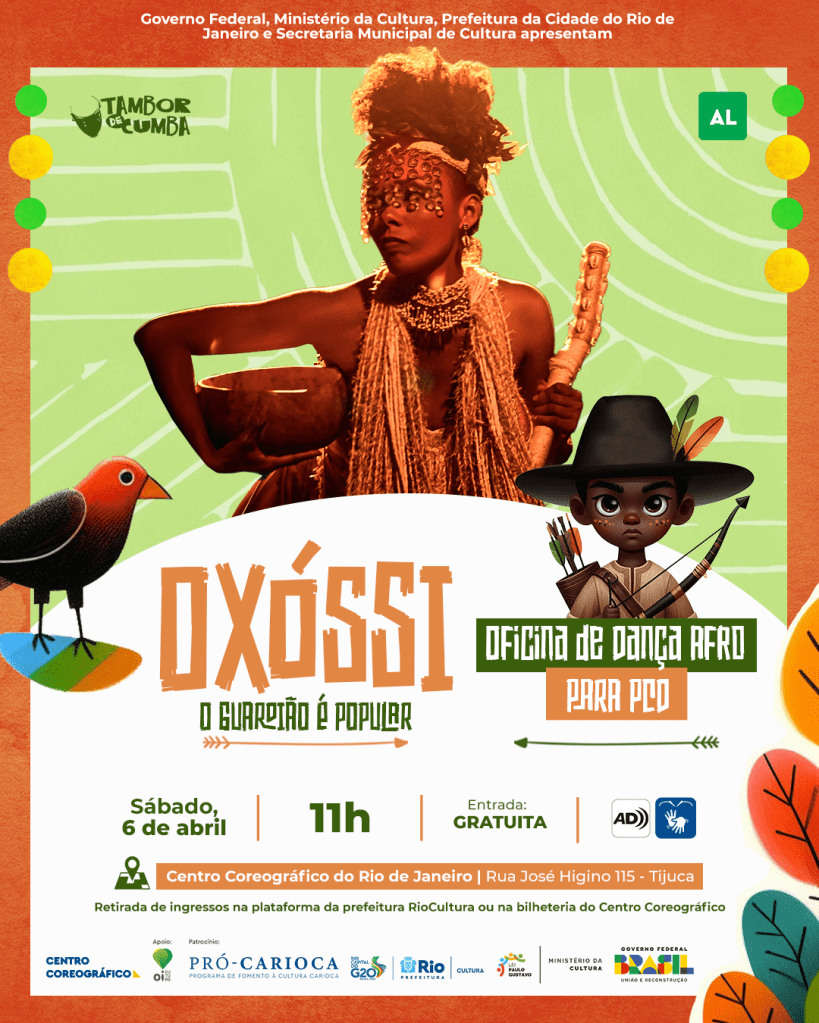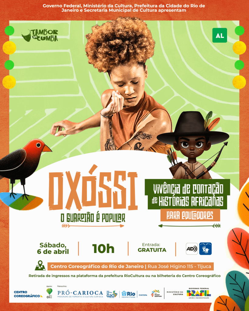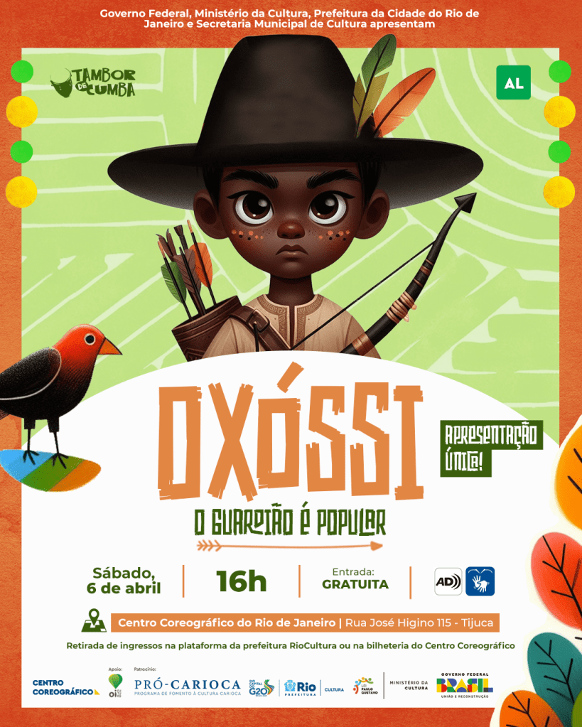 Resumo: Oxóssi – O Guardião é Popular, é um espetáculo infantil de dança afro, desenvolvido pelo Grupo Tambor de Cumba, que apresenta um mito tradicional da sociedade Iorubá onde diversos caçadores são convocados para abater o grande pássaro das feiticeiras que aterrorizavam a cidade de Ilê Ifé, berço da civilização iorubá, durante o período de festas da colheita de inhames. Com uma hora de duração, o espetáculo propõe despertar o imaginário infantil com base nas tradições culturais de origem africana por meio de danças, tambores e elementos estéticos pertencentes à cultura iorubá. No mito, Oxóssi é o guerreiro caçador que salva a sua aldeia dos poderes das bruxas trazendo alegria e prosperidade para o seu povo.