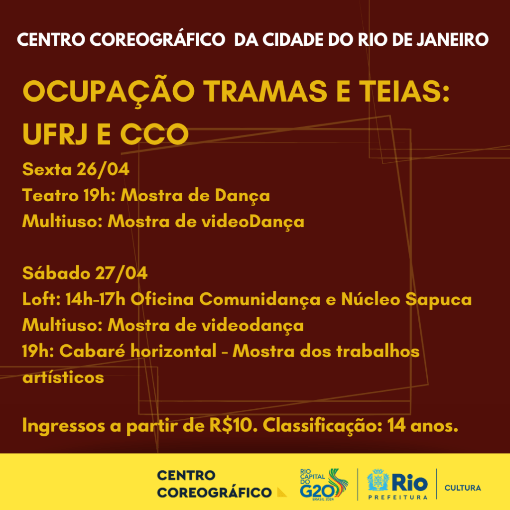 Resumo: Tramas e Teias: CCO & UFRJ tem como objetivo ocupar todos os espaços do CCO durante três dias com trabalhos artísticos de professores e alunos advindos dos cursos de graduação e pós-graduação em dança da UFRJ.