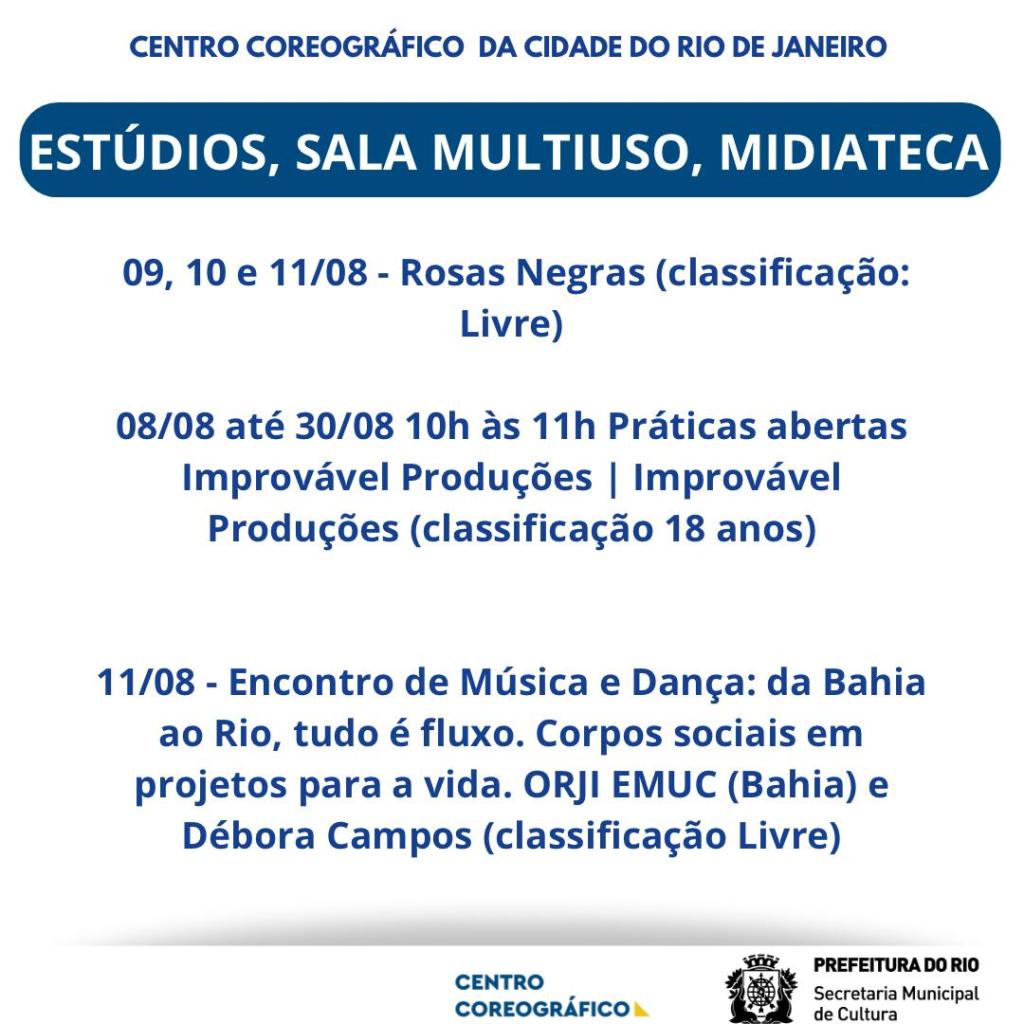 09/08 13h – 17h – Oficina aberta. Rosas Negras e convidada. A oficina é aberta ao público, considerando que o projeto, que teve origem em residência artística, visa os interessados em dança, corpo e memória. A convidada será a artista Teresa Carlos (México).