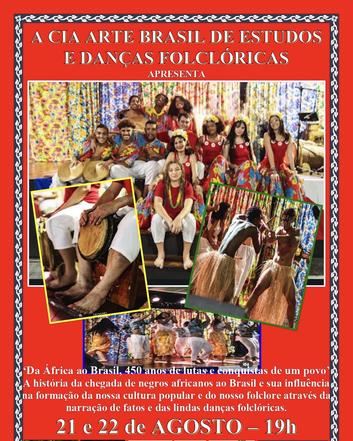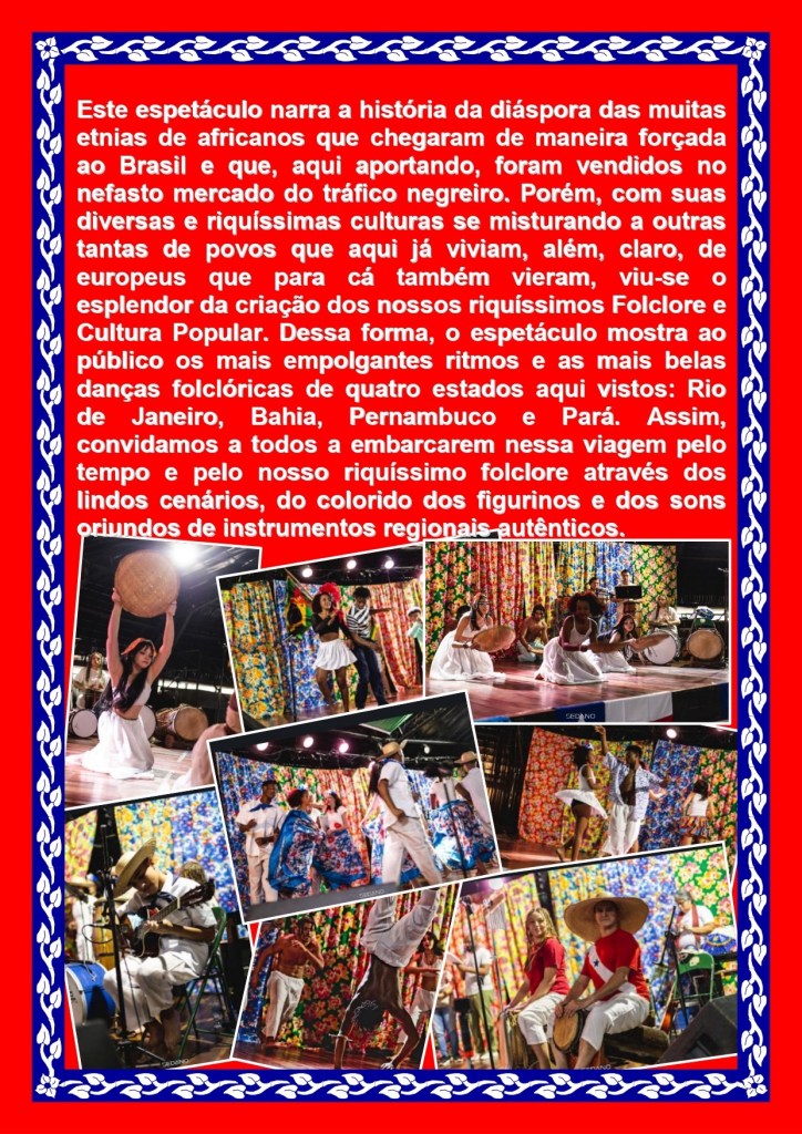 Resumo: O espetáculo narra a diáspora das muitas etnias de africanos que chegaram de maneira forçada ao Brasil e que, aqui aportando, foram vendidos no nefasto mercado do tráfico negreiro. Porém, com suas diversas e riquíssimas culturas se misturando a outras tantas de povos que aqui já viviam, além, claro, de europeus que pra também vieram, viu-se o esplendor da criação dos nossos riquíssimos Folclore e Cultura Popular. Dessa forma, o espetáculo mostra ao público os mais empolgantes ritmos e as mais belas danças folclóricas de quatro estados aqui vistos: Rio de Janeiro, Bahia, Pernambuco e Pará. Assim, convidamos a todos a embarcarem nessa viagem pelo tempo e pelo nosso folclore através dos lindos cenários, do colorido dos figurinos e dos sons oriundos de instrumentos regionais autênticos.