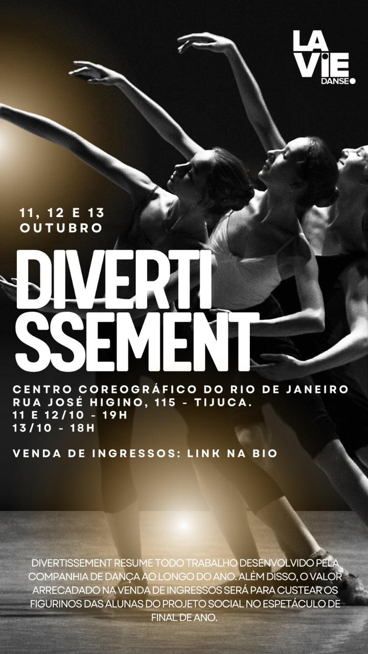Resumo: Divertissement é um espetáculo que apresenta o resultado de um ano de trabalho da Companhia La Vie Danse e do Projeto Made In La Vie com foco nas linguagens do Ballet Clássico, Jazz, Sapateado e Contemporâneo. Todo o dinheiro arrecadado com a bilheteria será revertido para custear os figurinos dos jovens atendidos pelo projeto social.