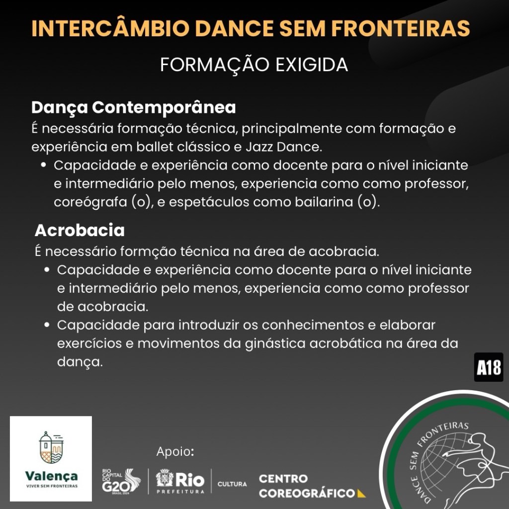 Histórico da cia: A associação nasce, com o firme propósito de seguir ampliando os trabalhos na região, levando a arte da dança e sua formação a todos, na cidade de Valença, onde nossa escola já funciona há mais de 15 anos. Além da escola, também realizamos, com o apoio da Câmara Municipal de Valença, o nosso mais novo projeto em execução, desde 2019, iniciamos o programa pioneiro de RESIDÊNCIA ARTÍSTICA E INTERCÂMBIO INTERNACIONAL, para novos coreógrafos e professores de dança do Brasil, de várias técnicas de dança, como ballet clássico, dança jazz (lírico e musical), dança contemporânea e danças urbanas.