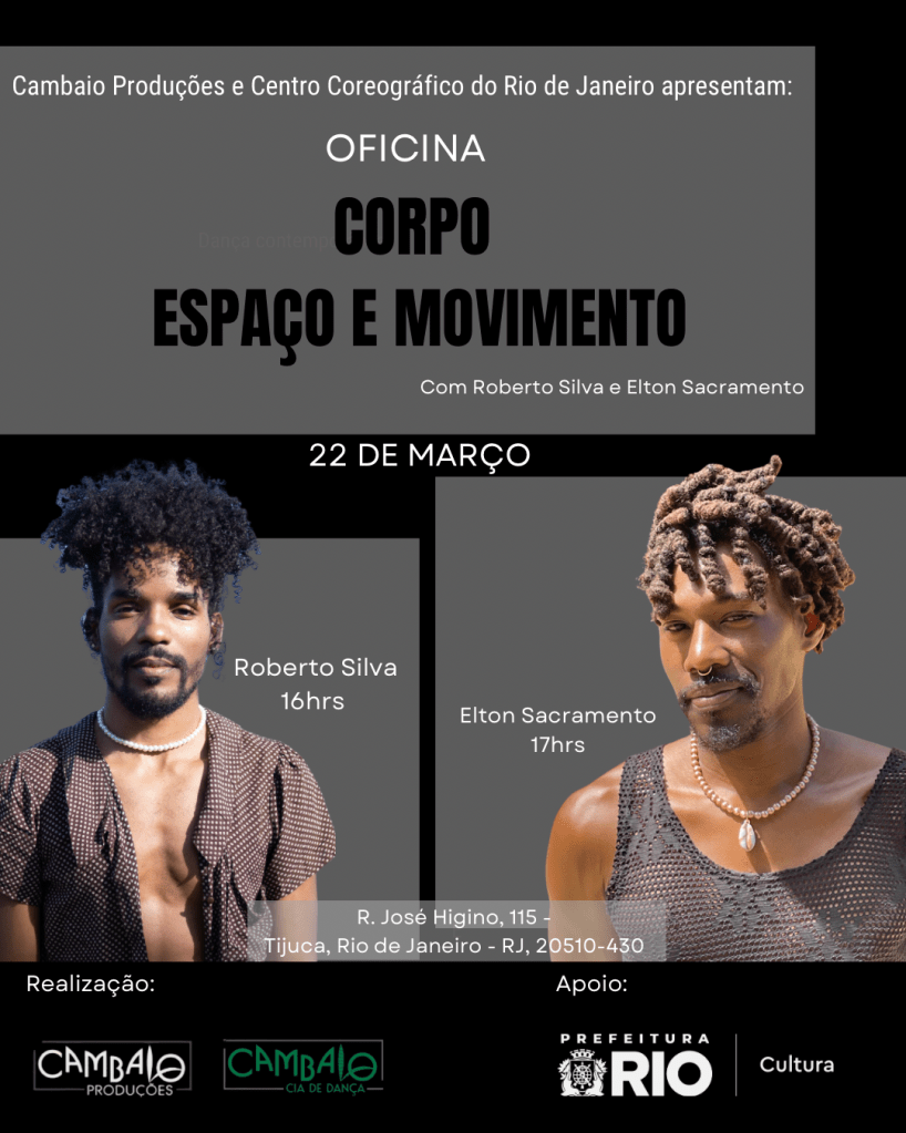 Roberto Silva: Possui formação pela Escola de Dança Marta Bastos, Rio de Janeiro/RJ. Integrou o elenco de Faces Ocultas Cia de Dança, Salto/SP; CIA Movimentos, Itú/SP; Petruska Ballet, Rio de Janeiro/RJ; Cia Khoros, Rio de Janeiro/RJ. Atua como bailarino, intérprete criativo, coreógrafo, ensaiador, diretor artístico e diretor geral da Cambaio Companhia de Dança, Cia com várias indicações e prêmios conquistados durante nove anos de resistência. Também dirige o espaço cultural Casa Cambaio, na Zona Oeste do Rio de Janeiro.