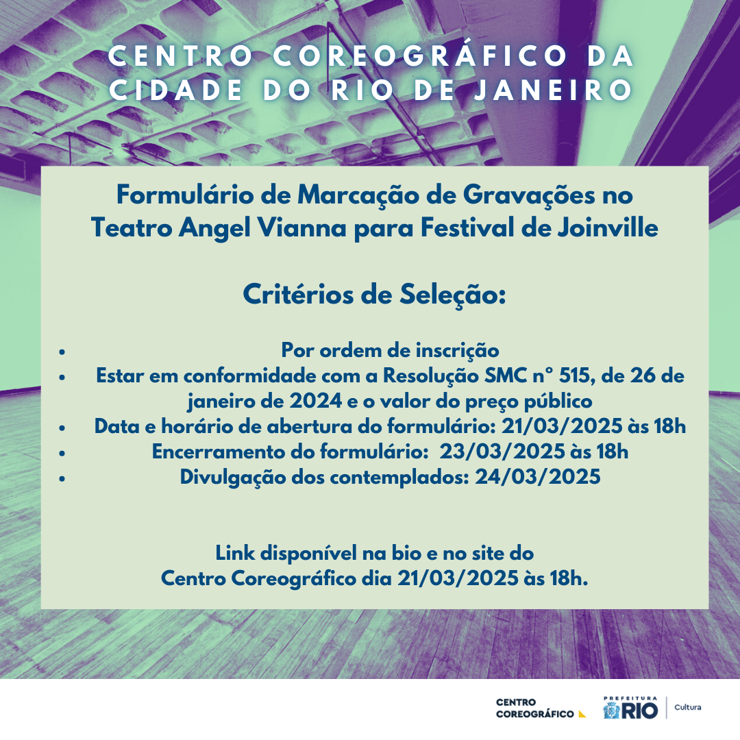 Com o objetivo de atender ao grande número de solicitações para o agendamento de gravações de coreografias no Teatro Angel Vianna, do Centro Coreográfico, visando à submissão ao Festival de Dança de Joinville, elaboramos este formulário para a solicitação de agendamento.