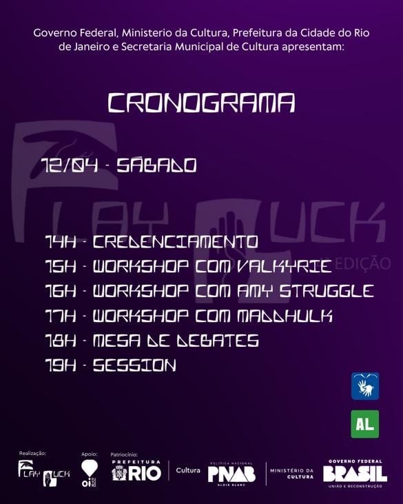 Resumo: Play Buck é um evento de Krump, destinado ao público “iniciante”. Nessa nova edição o projeto se dividirá em duas principais atividades. Sendo a primeira o programa de formação de Krump e Libras e a segunda a realização da 4ª edição do evento com mesa de debates, workshops, sessions e as 3 categorias de batalhas: All Style, Feminina e Iniciante.