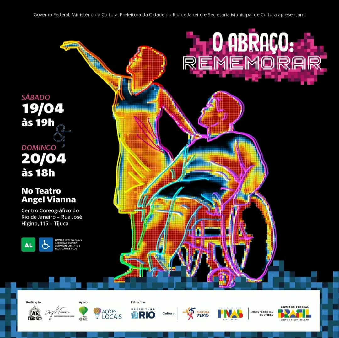 Resumo O Abraço: Rememorar” é um espetáculo de dança “Coletivo Ver e Não Ver” com protagonismo de pessoas com deficiência e acessibilidade embutida Em cena, duas intérpretes, Carol Bahia (pessoa em cadeira de rodas e paralisia cerebral) e Sandra Santos (pessoa com deficiência visual parcial), exploram a interação sensorial, criando uma rica tapeçaria de movimentos que evocam a empatia e a compreensão, através de um abraço ao mesmo tem literal e metafórico, em uma jornada poética que celebra a diversidade, a inclusão e a singularidade dos corpos dispostos e livres. A trilha musical do espetáculo é composta e interpretada ao pelo violonista Artur Gouvêa.