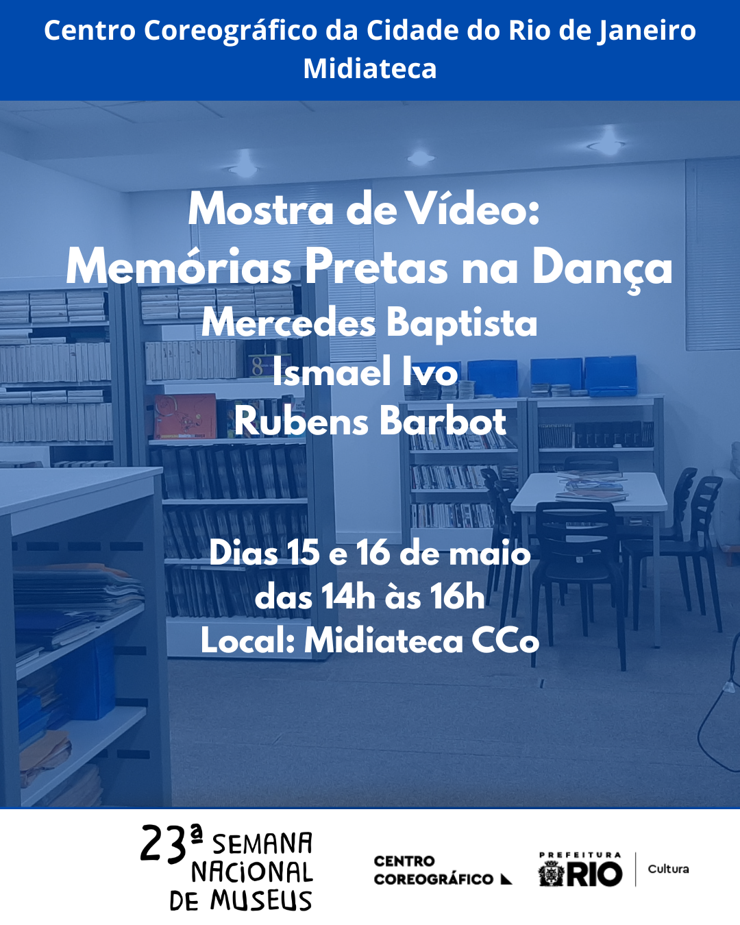 O Centro Coreográfico da Cidade do Rio de Janeiro através do seu setor de Acervo, Memória e Pesquisa – Midiateca – participará da 23a Semana Nacional de Museus com a exibição de alguns vídeos do seu acervo, seguida de roda de conversa. A “Mostra Memórias Pretas na Dança”, buscará incentivar a reflexão sobre o “Corpo negro dançante” enquanto Patrimônio Imaterial vivo. Tendo como inspiração o mês de maio, que também celebra a Abolição da Escravatura, foram selecionados para a Mostra vídeos de dança de três coreógrafos-bailarinos brasileiros negros (Mercedes Baptista, Ismael Ivo e Rubens Barbot), revelando suas contribuições para a criação de ações mais inclusivas e diversas na Dança nacional e internacional.