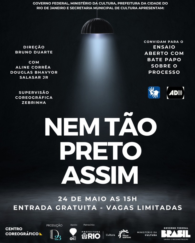 Resumo: Nem Tão Preto assim, busca explorar de forma crítica as danças urbanas como ferramentas para questionar e subverter as narrativas que buscam aprisionar corpos negros em clichês coloniais. A pesquisa incluirá técnicas variadas como hip hop, krump, capoeira e dança contemporânea, explorando temas de resistência cultural e identidade negra. Neste segundo e último ensaio aberto será apresentada a criação,pesquisa de movimento e dramaturgia desenvolvida pelo grupo ao longo dos 4 meses de residência realizado no Centro Coreográfico com direção de Bruno Duarte e supervisão artística e coreográfica de Zebrinha.