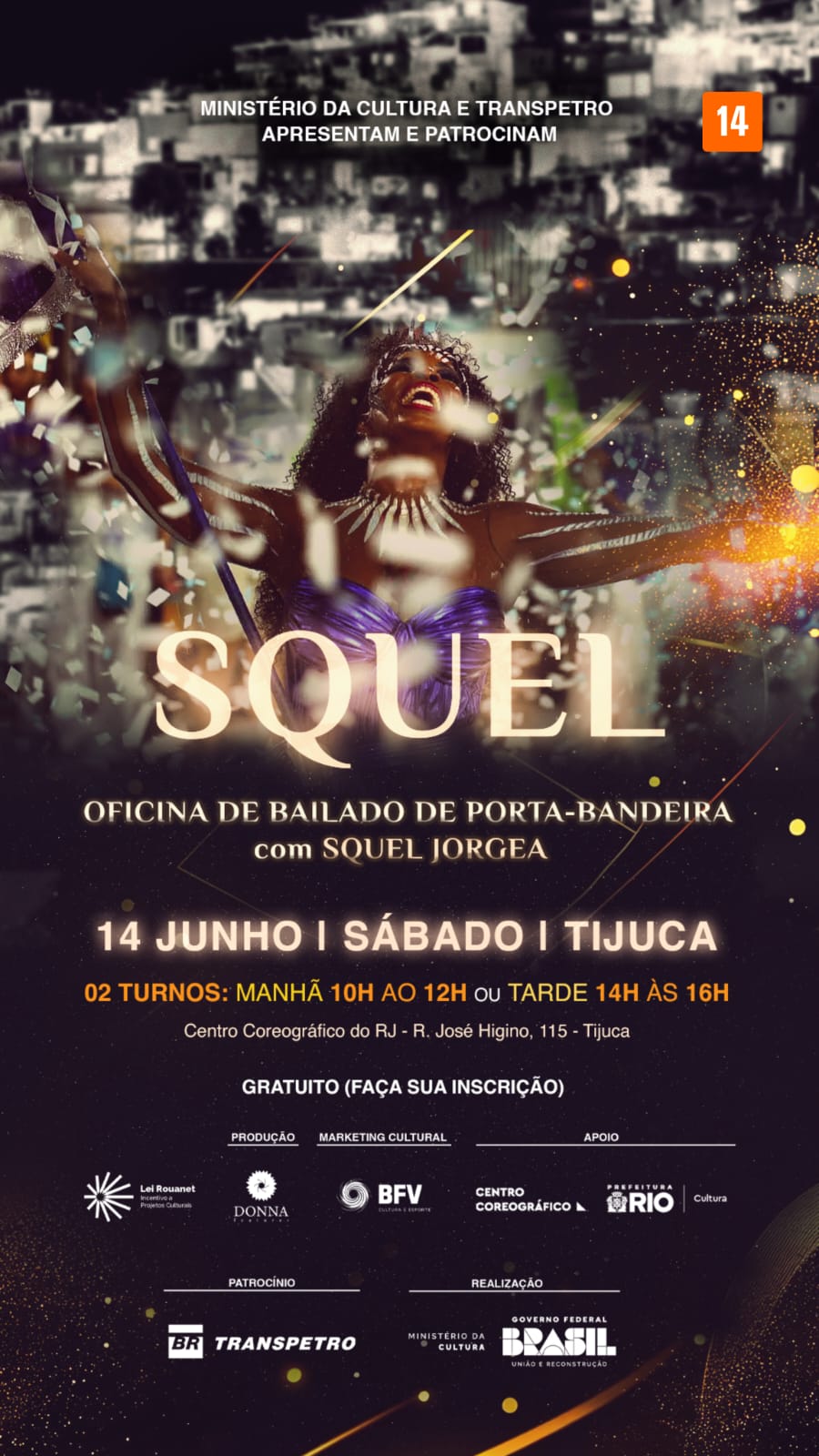 Resumo: O projeto Squel – Oficinas de bailado de porta-bandeira é parte integrante do documentário Squel Memórias de uma porta-bandeira, que vai retratar a vida de Squel Jorgea, porta-bandeira brasileira. Além de ser duas vezes campeã do carnaval carioca pela Estação Primeira de Mangueira, Squel também é vencedora de dois Estandartes de Ouro e atualmente defende a Escola de Samba Portela. O projeto irá realizar 20 oficinas gratuitas de bailado de porta-bandeira no Estado do Rio de Janeiro, em locais ainda a definir. As vagas serão destinadas ao público prioritário com faixa etária de 18 a 60 anos, dentre: mulheres, pessoas LGBTQIA+, mulheres em vulnerabilidade social e PCDs. As imagens captadas durante o projeto serão utilizadas no documentário. O projeto será realizado entre maio a julho de 2025. As oficinas serão ministradas pela própria Squel Jorgea, e tem como propósito principal empoderar seus participantes, em especial, mulheres jovens negras, sejam elas cis, trans, moradoras de periferias e ou comunidades, mulheres que se encontram em vulnerabilidade social.
