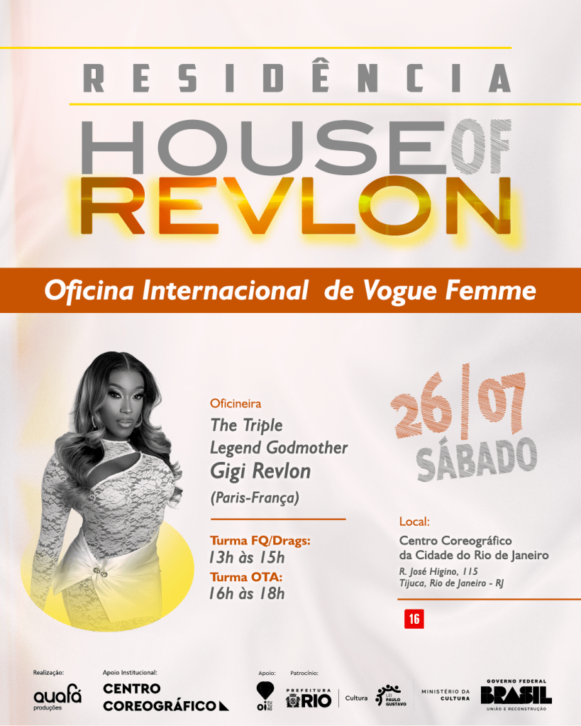Resumo: Atividade parte integrante do projeto de residência artística da House of Revlon que terá integrantes do coletivo de outros Estados e da França. No encerramento da residência, numa 4a ação aberta ao público, será realizada uma oficina Vogue Femme ministrada por uma presenção internacioanl, diretamente da França: The Triple Legend Godmother Gigi Revlon.