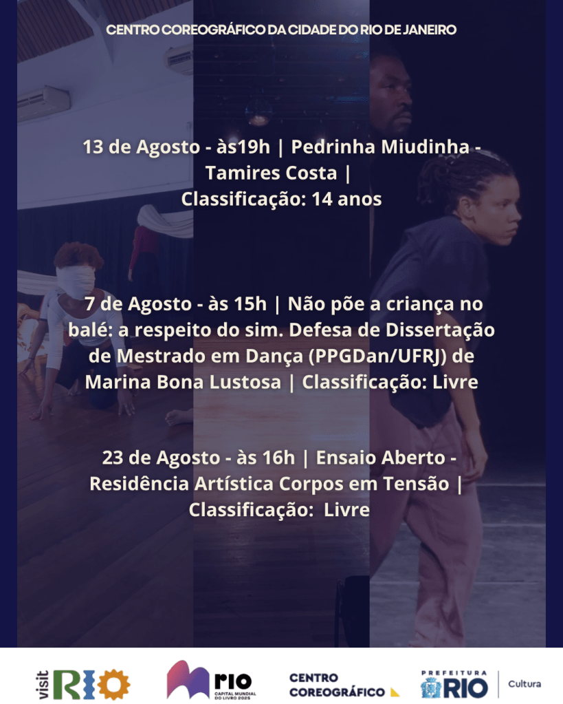 Resumo: Corpos em Tensão é um projeto de residência artística iniciado em março de 2025 no Centro Coreográfico da Cidade do Rio de Janeiro, voltado para investigações corporais a partir de materiais físicos e práticas coletivas de presença e tensionamento dos corpos em cena. A residência foi estruturada em dois módulos de oficinas formativas, ao longo do processo os encontros promoveram espaço de experimentação e construção cênica. O projeto culmina com a criação de um espetáculo inédito que será apresentado ao público, em processo, em agosto de 2025 no Centro coreográfico da cidade do Rio de Janeiro.