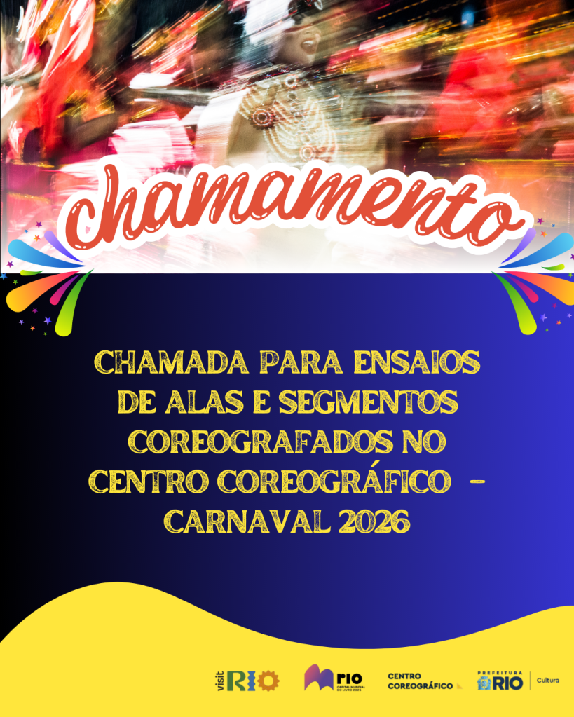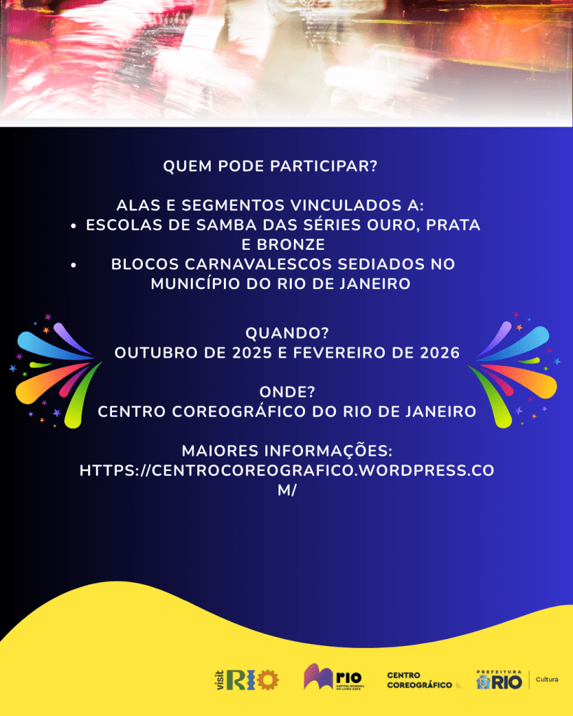 Na esteira desta conquista para a cultura carnavalesca, o Centro Coreográfico está abrindo uma chamada para selecionar propostas para ocupação de segmentos coreografados de escolas de samba da série Ouro, Prata e Bronze, além de segmentos coreografados de blocos carnavalescos em preparação para o carnaval de 2026.
