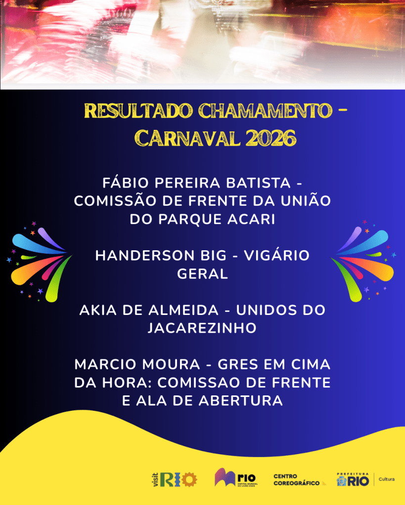Resultado do Chamamento Carnaval 2026 – Em breve a equipe do Centro Coreográfico entrará em contato para agendar os ensaios que se iniciam em Outubro.