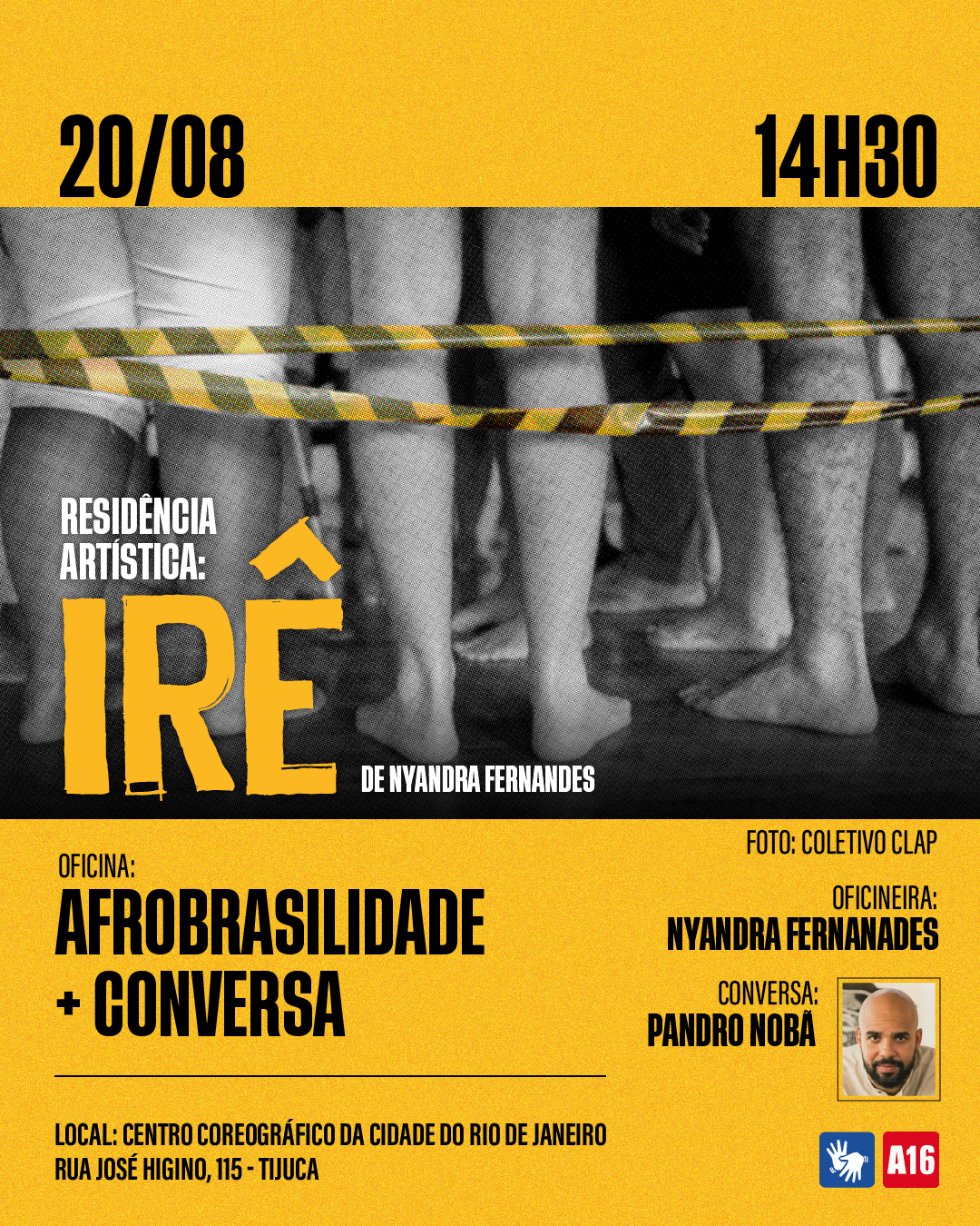 Resumo: Segunda ação aberta ao público do projeto de residência artística IRÊ, de Nyandra Fernandes. Nyandra irá conduzir a Oficina Afrobrasilidade, compartilhando sua vivência a partir das diversas práticas que atravessam sua trajetória, como as danças populares e a dança contemporânea.