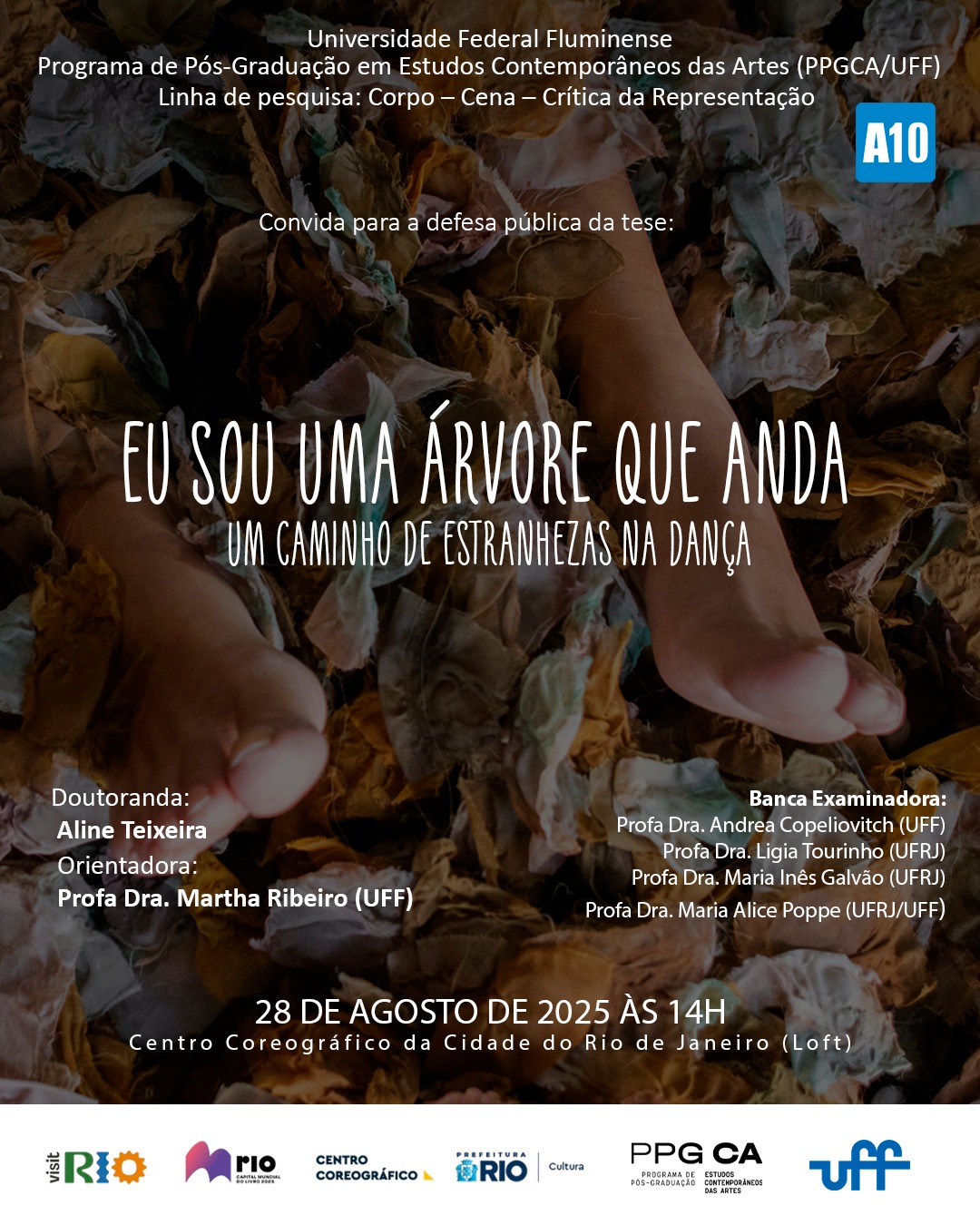requisitos para obtenção do título de Doutor(a) em Artes. A pesquisa, orientada pela Professora Martha Ribeiro, é fruto de um caminho onde as estranhezas são ressaltadas através das diferenças presentes em corpos que dançam, sejam eles humanos ou não. As árvores e as plantas são motores principais de atualização nos processos de investigação criativa do corpo e do espaço e proporcionam outras perspectivas de ser, estar e dançar no mundo.