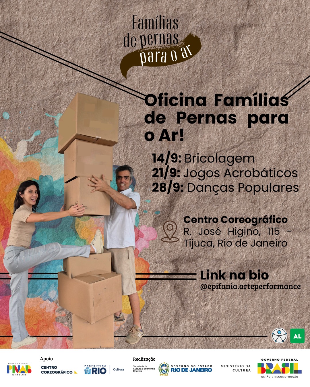 Resumo: Famílias de Pernas Para o Ar é um projeto aprovado no edital Fluxos Fluminenses 2025, no qual propõe um conjunto de três oficinas gratuitas voltadas para o público infantil junto com seus familiares, participando de forma lúdica e espontânea. A partir da dança, teatro e acrobacia, diferentes experiências de integração e diversão serão propostas. A sonoridade será conduzida por um músico ambientando e estimulando as atividades. Cada oficina possui duração de 3 horas, com 40 vagas. Os temas são Danças Populares, Jogos Acrobáticos e Bricolagem. A dança, juntamente com a música, é uma das formas mais antigas de demonstração criativa e comunicação não verbal exercida. Na oficina Famílias de Pernas Pro Ar, as crianças e seus familiares, serão conduzidos a um mergulho na cultura popular, nas atividades acrobáticas feitas em grupos, na brincadeira manual criativa e principalmente na expressão corporal.