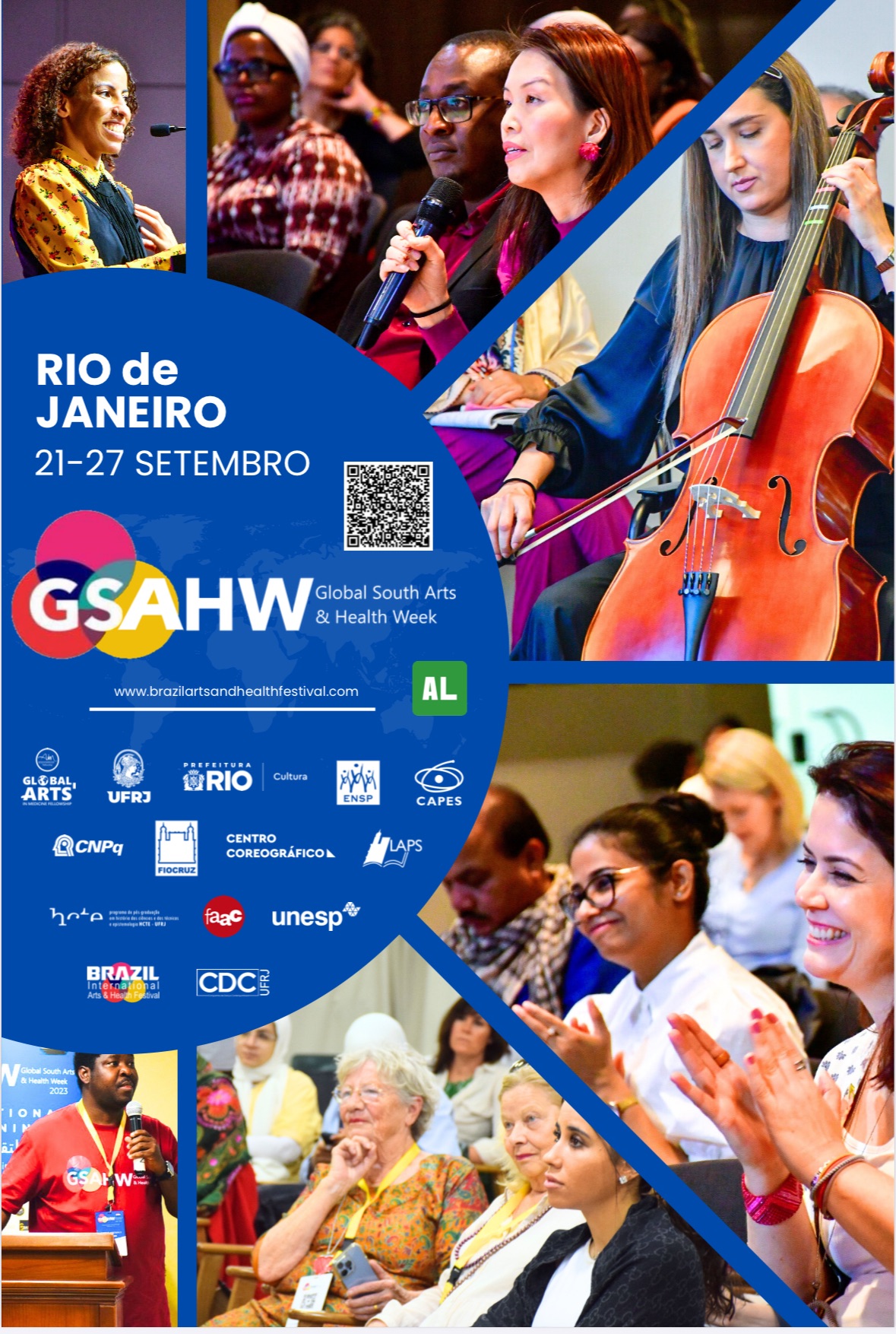 Histórico do evento: A primeira edição da GSAHW ocorreu entre 23 e 30 de setembro de 2023 no Egito, com eventos satélites em vários países, incluindo o Brasil, organizada por Dra. Ana Carmen Nogueira (professora de arte) e Dra. M. Lucia Bianconi (IBqM/UFRJ). As mesmas organizaram o GSAHW Brazil Pavillion 2024 que ocorreu entre 18 e 21 de setembro do corrente, em São Paulo e no Rio de Janeiro. Outros países (Gana, Paquistão, Uganda, Inglaterra, Nigéria, Emirados Árabes, Irlanda, África do Sul, Argentina, Síria e Etiópia) estão oferecendo seus respectivos pavilhões desde Junho de 2024 e o evento principal, internacional, foi no Qatar, de 23 a 30 de novembro em 2024. A GSAHW é considerada a primeira olimpíada de artes e saúde. Explora terapias criativas e abordagens sociais inovadoras que contam com histórias de sucesso ao redor do mundo. Com uma abordagem interdisciplinar, o programa se estende a hospitais, centros médicos e museus.