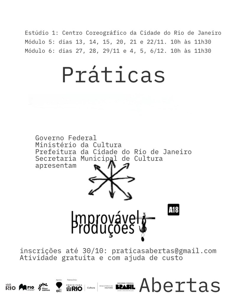 Resumo: Bora praticar?! Nos meses de novembro e dezembro a Improvável Produções abrirá os módulos 5 e 6 de práticas abertas para convidades. Serão 6 encontros por módulo e 10 bolsas de 300 reais para cada módulo. Para se inscrever, basta enviar uma mini bio de até 1.000 caracteres + carta de intenção para o e-mail praticasabertas@gmail.com até o dia 30/10 , indicando no assunto do e-mail para qual dos dois módulos é a inscrição.