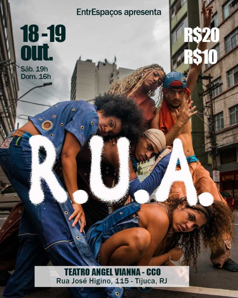 O EntrEspaços apresenta o espetáculo R.U.A., da Cia Vitória Street Dance, dentro da programação do EntrEspaços convida. Com direção geral de Lalau Martins e coreografia de Luis Silva, o trabalho mergulha na energia das danças urbanas para refletir sobre a vida cotidiana nas periferias das grandes cidades.