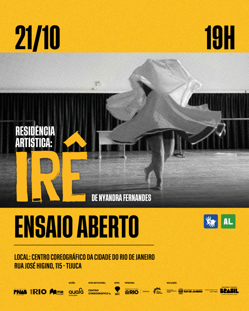 Resumo: Iniciada em julho, a Residência Artística Irê, de Nyandra Fernandes, chega ao seu primeiro ensaio aberto ao público. Neste momento será compartilhado uma parte do processo criativo da artista, o primeiro trabalho solo da carreira. A obra traz para a cena um eixo fundamental: a ideia de ideia de construção, em seu imaginário sonoro artístico e imagético. A proposta se revela como um importante momento profissional, reunindo em cena referências que marcaram a trajetória de Nyandra — da dança contemporânea ao funk, passando pelas danças afrobrasileiras e populares.