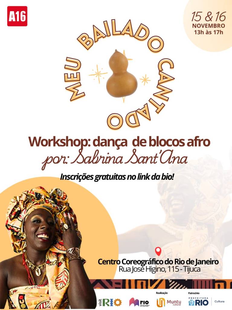 Resumo: Movimentos corpo e ritmo – O Workshop Meu Bailado Cantado é uma imersão de dois dias dedicada ao estudo, prática e celebração das danças afro-brasileiras que compõem a estética corporal dos blocos afros. Sob orientação da artista, coreógrafa e pesquisadora Sabrina Santana, reunindo participantes de diversas origens para vivenciar e refletir sobre os movimentos que resgatam e valorizam a ancestralidade africana no Brasil.