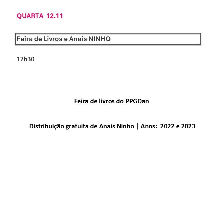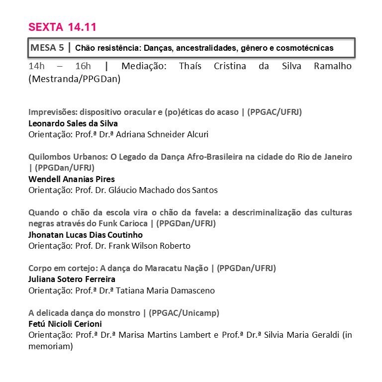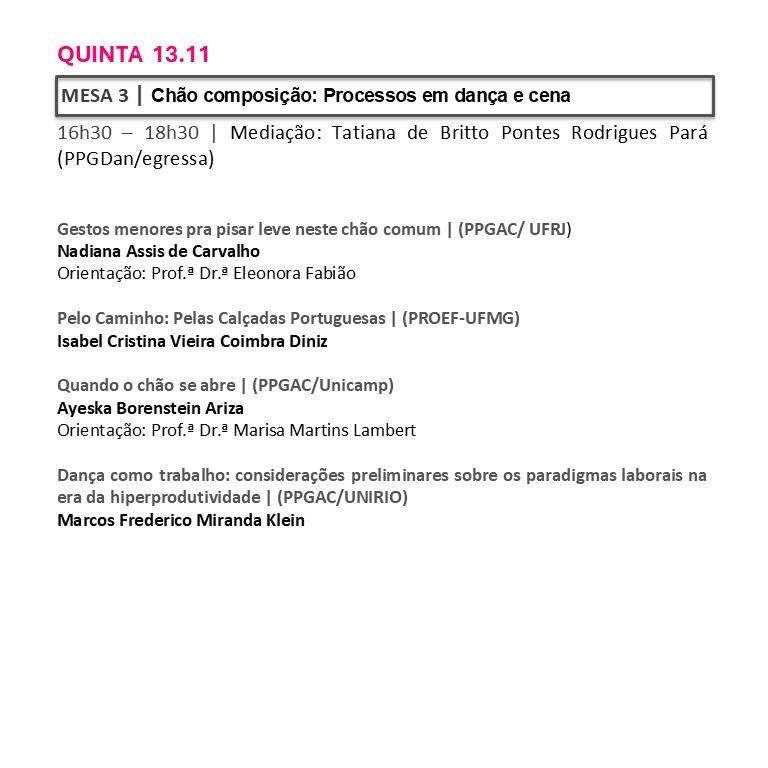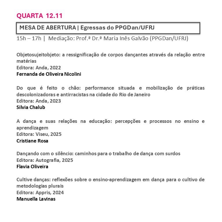 Resumo: Mesa de abertura do Seminário de Pesquisas em Andamento do PPGDan-UFRJ que chega em sua quarta edição, promovendo um encontro entre pesquisadores da pós graduação com pesquisas relacionadas à dança ou às artes da cena e do corpo incentivando a prática do compartilhamento das pesquisas, da apreciação e do debate.