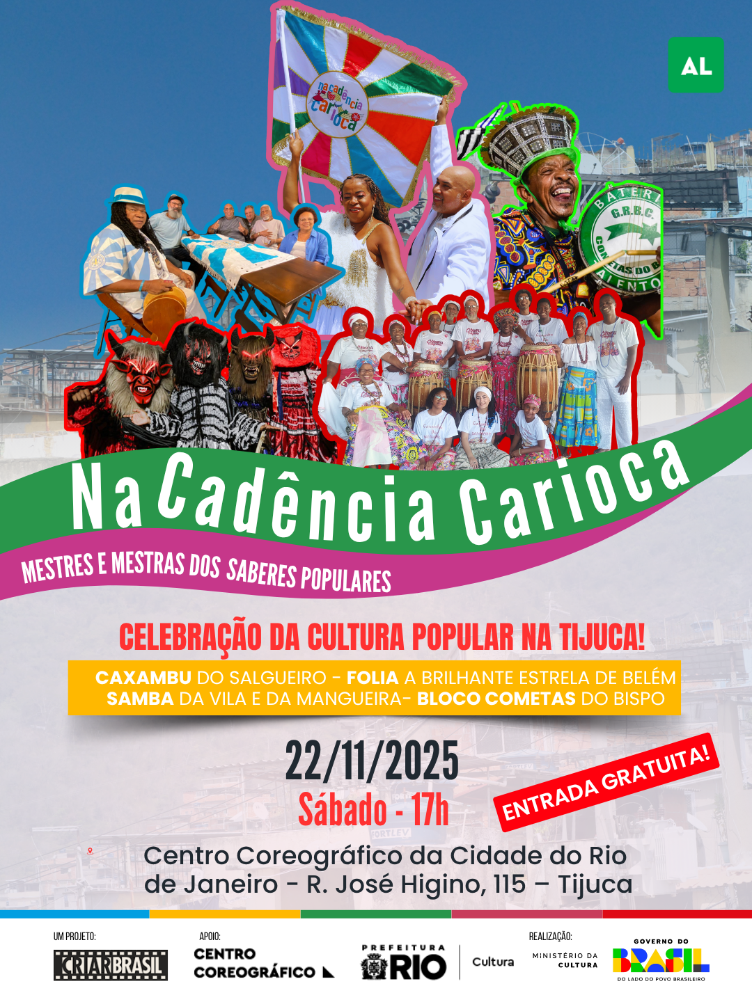 Resumo: Na Cadência Carioca: mestres e mestras dos saberes populares é um mergulho na alma cultural da Grande Tijuca, Zona Norte do Rio de Janeiro. Com atuação em cinco comunidades da região, o projeto leva ao palco em manifestações culturais símbolos de cada localidade: a Folia de Reis do Morro da Formiga, o bloco Cometas do Bispo do Turano, o Caxambu do Salgueiro, as porta-bandeiras da Mangueira e os compositores de samba de Vila Isabel. A apresentação será um grande encontro cultural, buscamos valorizar esses territórios e seus protagonistas.