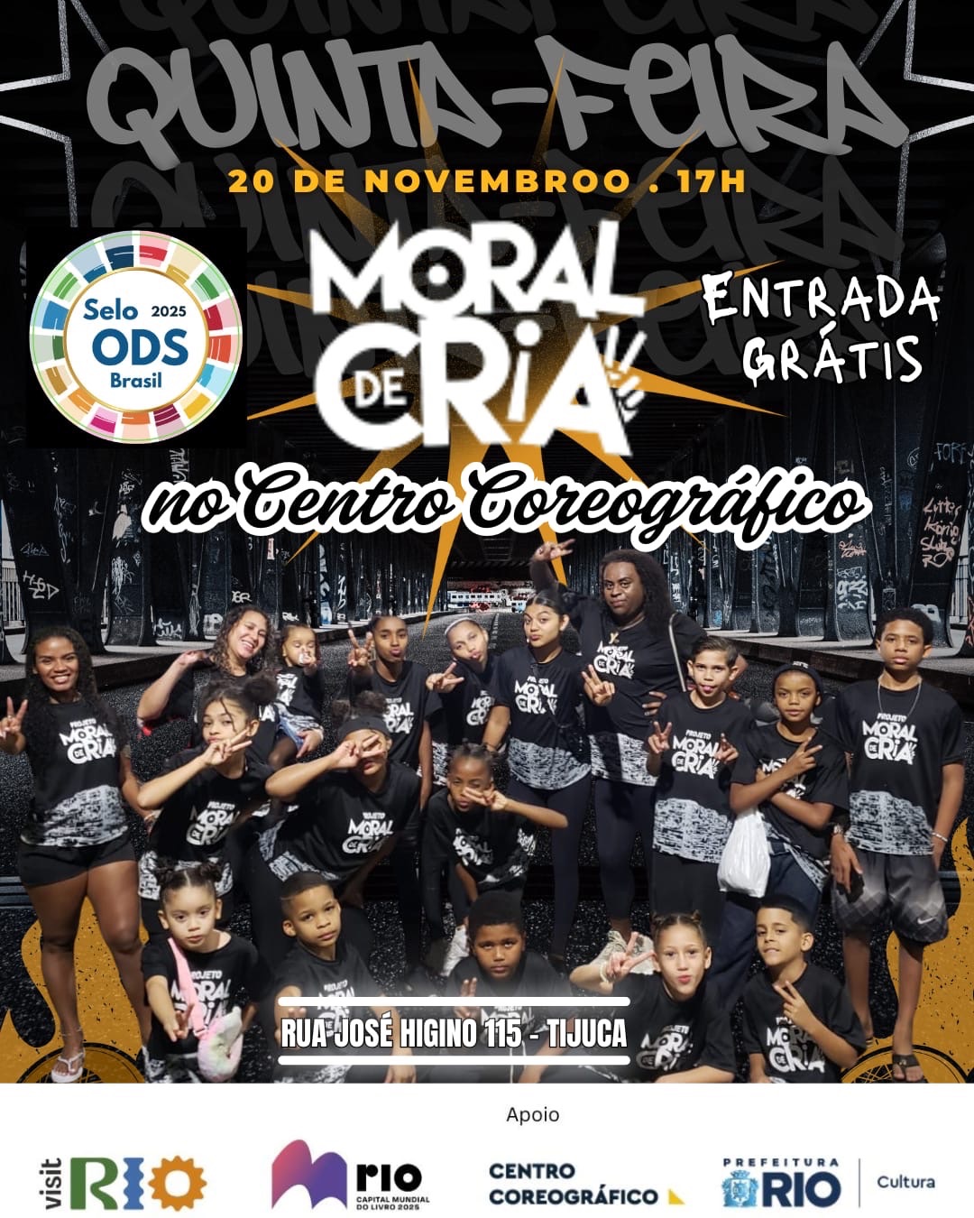 O Coletivo Moral de Cria, do Complexo do Andaraí, traz ao palco um trabalho vibrante que celebra a potência criativa das crianças e adolescentes da favela, fortalecendo vínculos comunitários por meio da dança, dos ritmos populares e da expressão corporal.