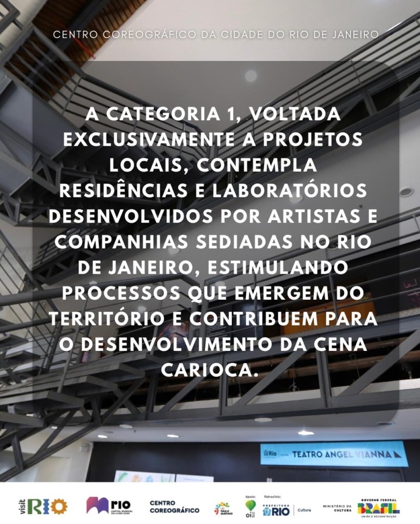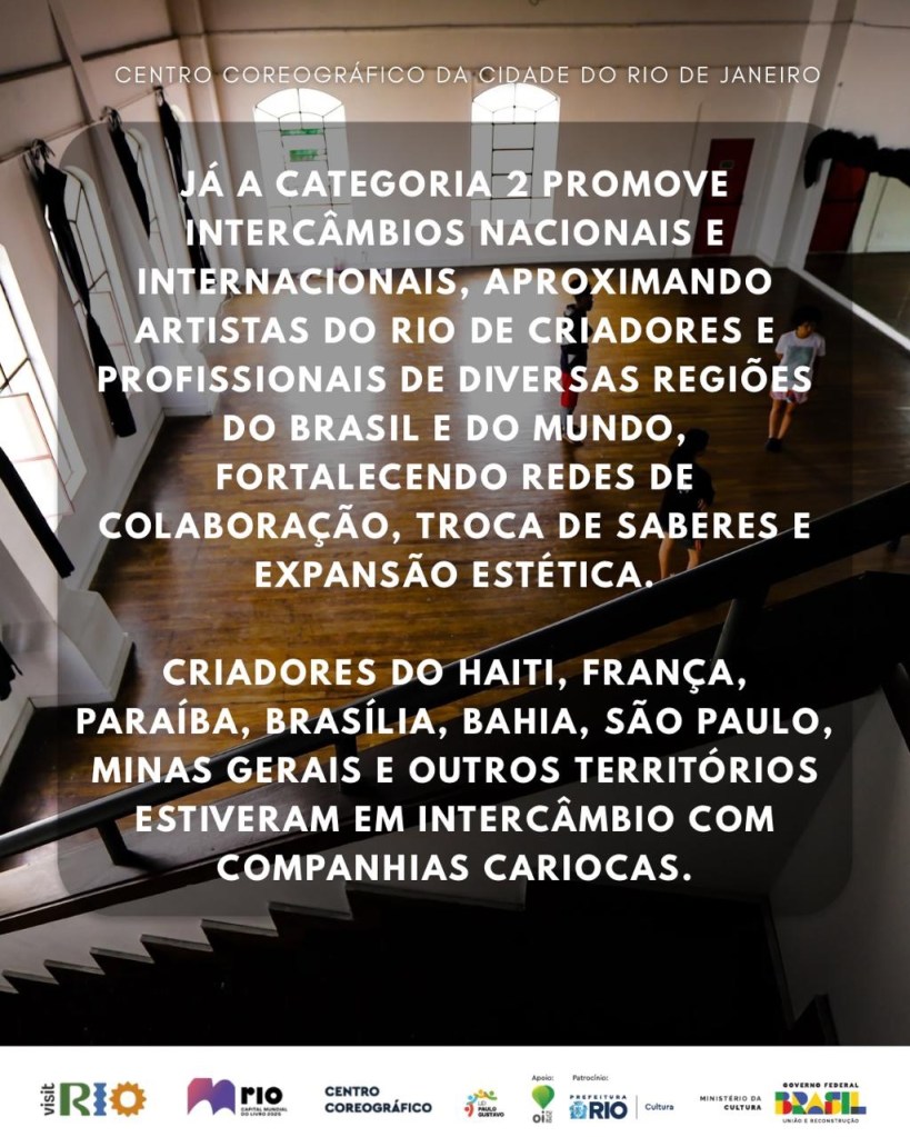 Já a Categoria 2 promove intercâmbios nacionais e internacionais, aproximando artistas do Rio de criadores e profissionais de diversas regiões do Brasil e do mundo, fortalecendo redes de colaboração, troca de saberes e expansão estética.