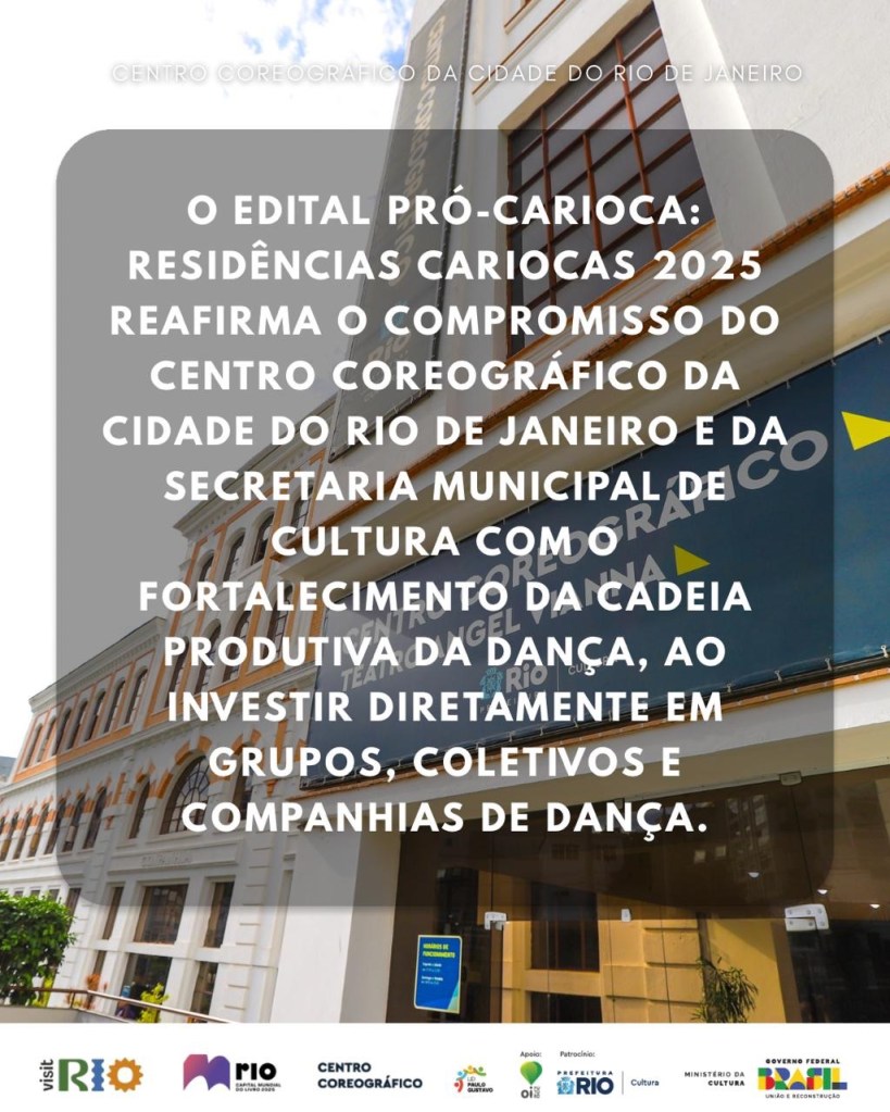 O edital Pró-Carioca: Residências Cariocas 2025 reafirma o compromisso do Centro Coreográfico da Cidade do Rio de Janeiro com o fortalecimento da cadeia produtiva da dança, ao investir diretamente em grupos, coletivos e companhias de dança, ampliando oportunidades de criação, pesquisa e formação continuada na cidade.