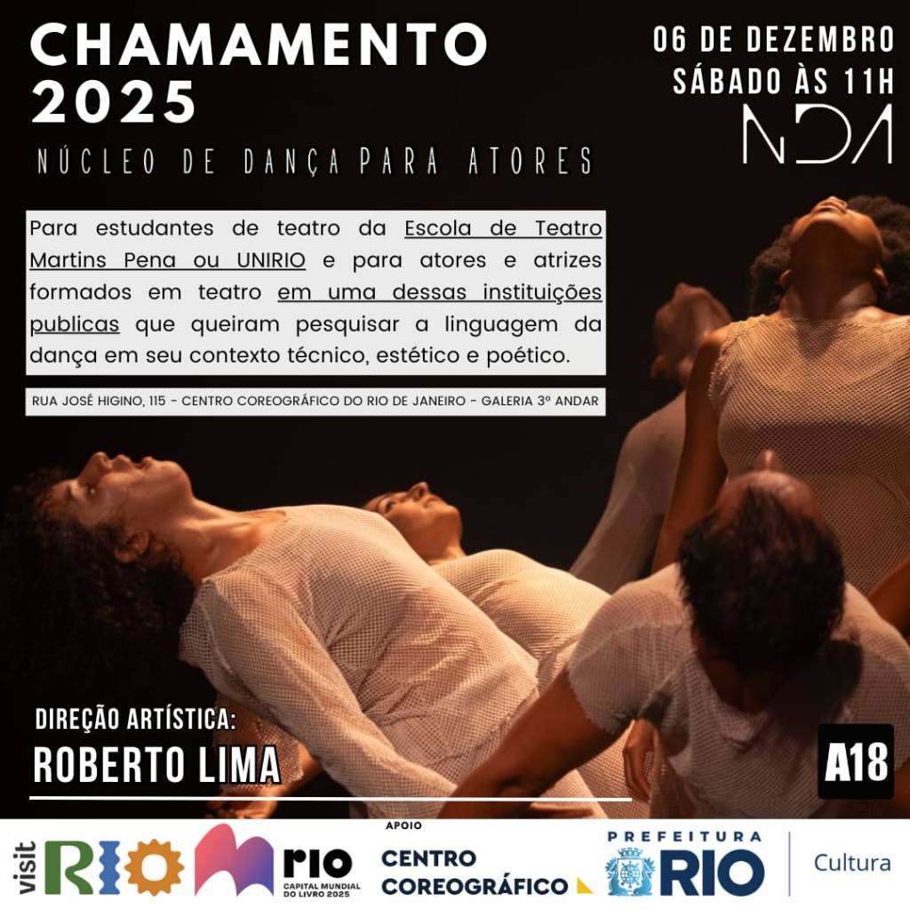 Resumo: Chamamento para novos intérpretes do Núcleo de Dança para Atores, voltado para alunos e ex-alunos de artes cênicas oriundos da Escola de Teatro Martins Pena e da Unirio (formados ou não).
