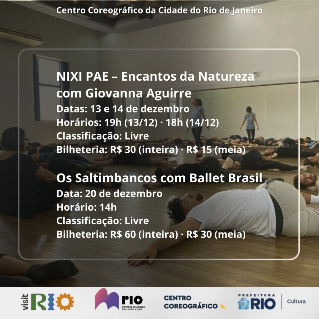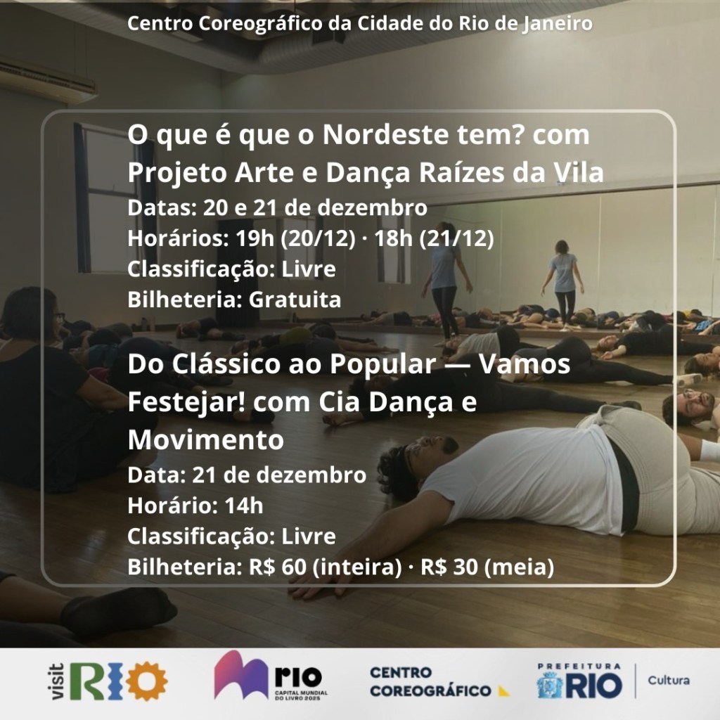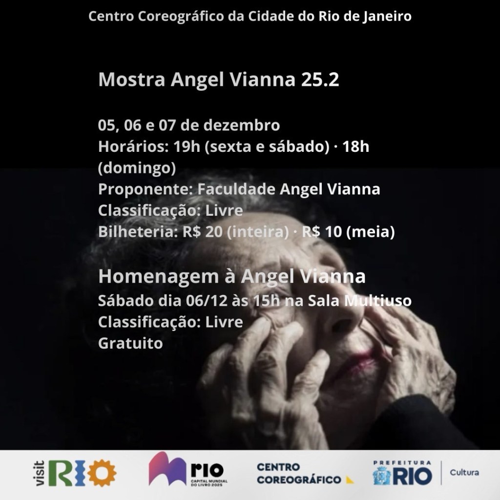 O Teatro Angel Vianna, espaço integrado ao Centro Coreográfico da Cidade do Rio de Janeiro, recebe ao longo de dezembro uma programação diversificada com espetáculos de dança e artes integradas, reunindo artistas, coletivos e instituições que compõem a cena cultural da cidade. As apresentações contemplam trabalhos adultos, infantis e familiares, com propostas estéticas variadas e acesso democrático ao público.