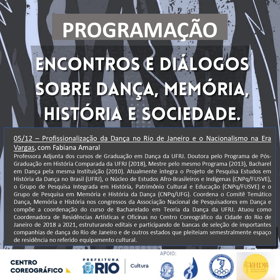 Em Dezembro, fechando o ciclo dos Encontros de 2025 teremos no dia 5 uma conversa dupla: a discussão dos temas “Profissionalização da Dança no Rio de Janeiro e o Nacionalismo na Era Vargas”, com Fabiana Amaral, e o “Ensino de História de Danças – contextos e perspectivas”, com Isabela Buarque.