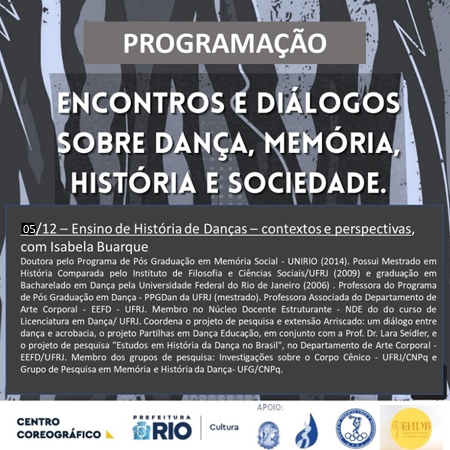 Encontros para aprofundamentos de pesquisas, diálogos e trocas sobre História da Dança no Brasil, observando as relações com questões sociais na contemporaneidade, envolvendo debates sobre memória e construções de paradigmas acerca do campo da Dança.