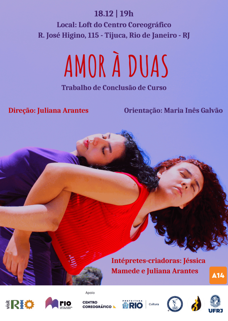 Resumo: Amor à Duas é um espetáculo de dança produzido para defesa de TCC de Bacharelado em Dança da UFRJ, pela aluna Juliana Arantes. Trata-se de uma narrativa autoficcional, que tem como pesquisa o relacionamento amoroso entre duas mulheres.