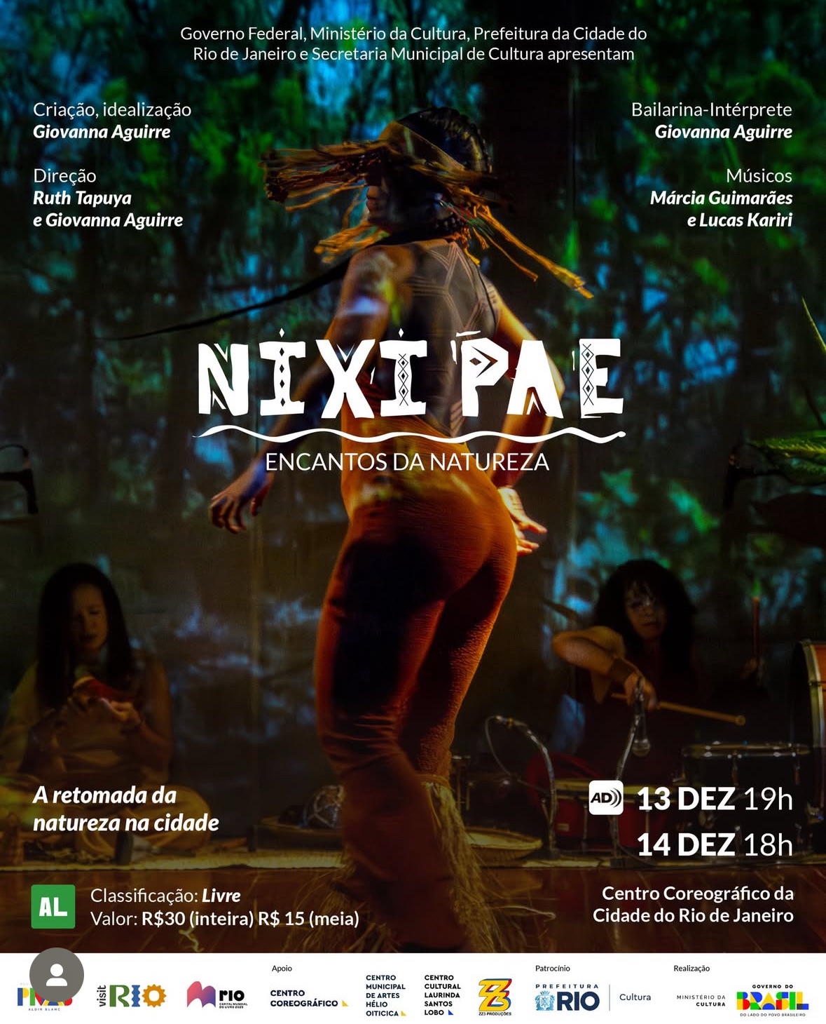 Resumo: NIXI PAE é um espetáculo-sopro de retomada da natureza nas cidades. NIXI PAE é o espírito da floresta, é a força dos animais, da natureza, dos encantados que sustentam e protegem toda a teia da vida.