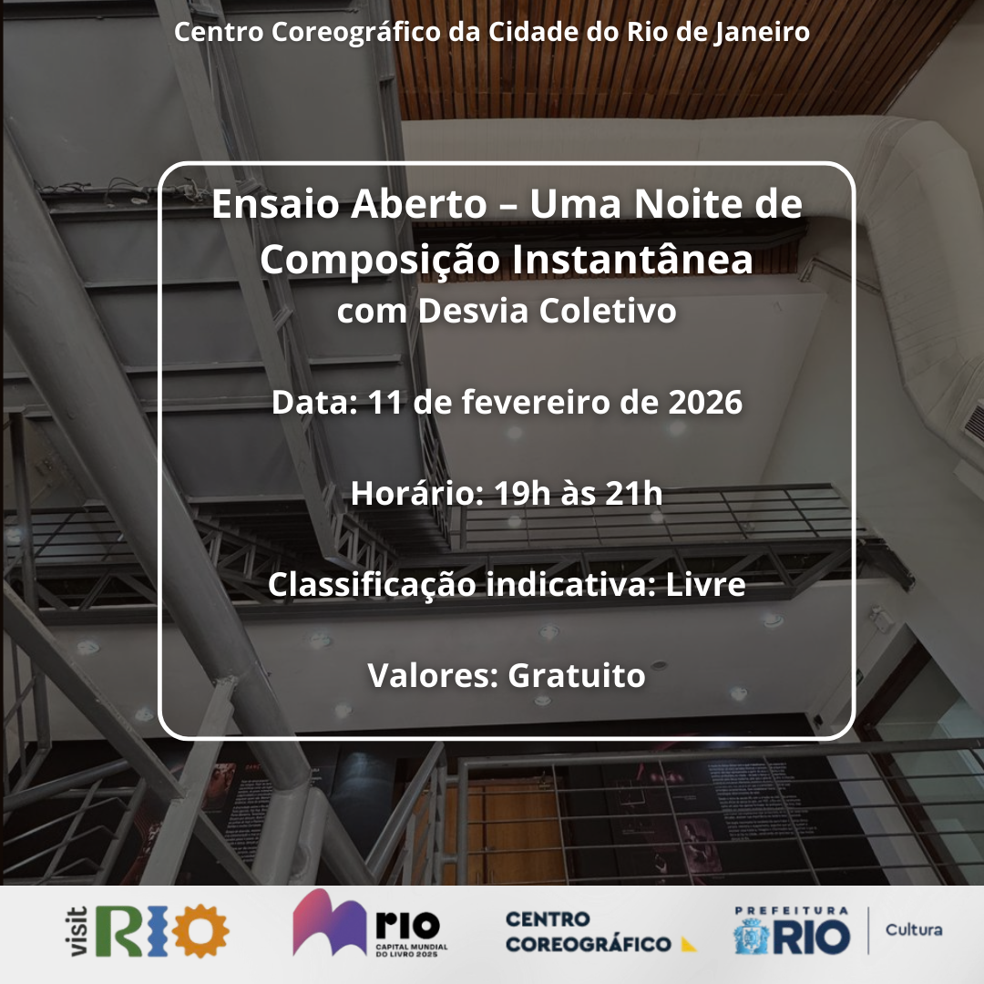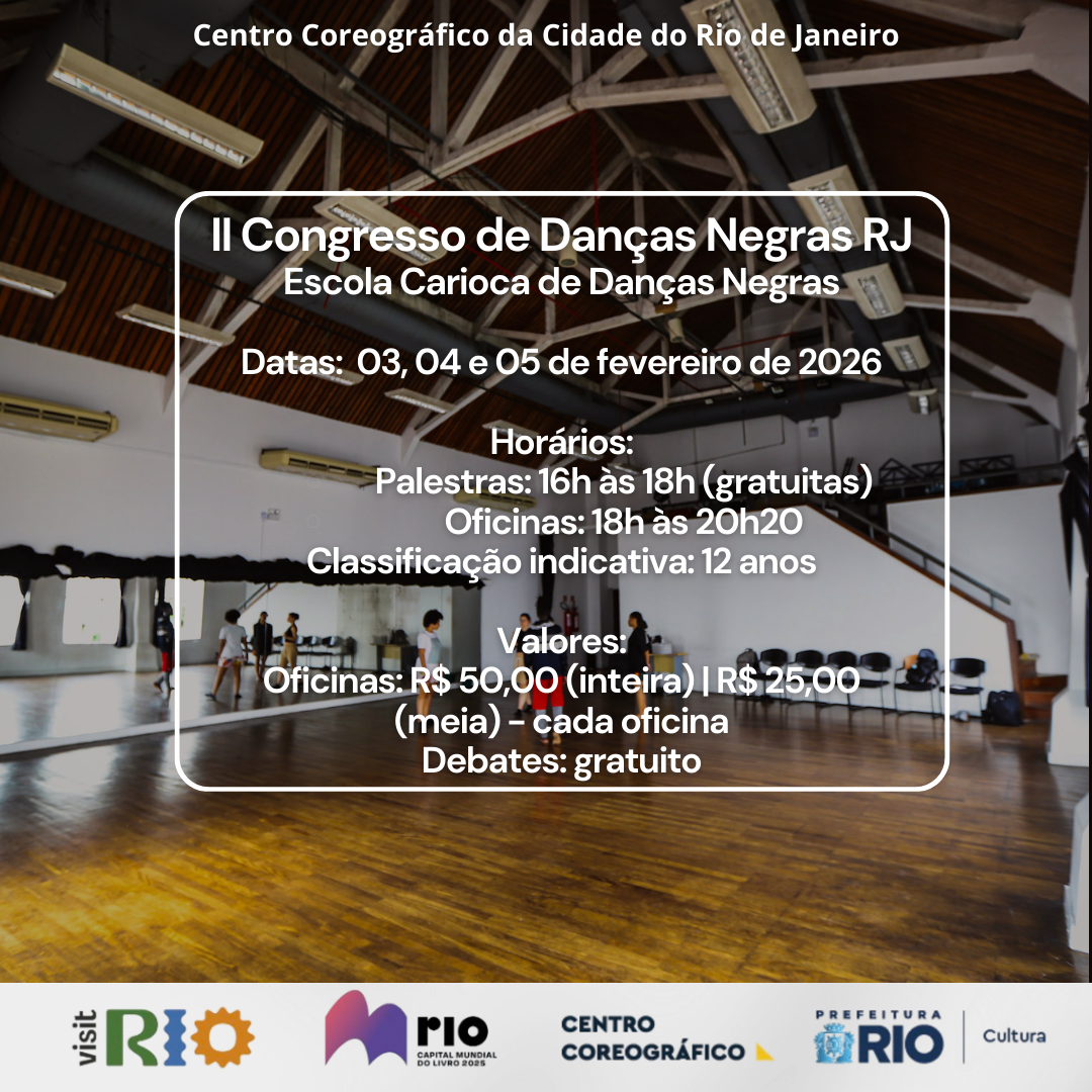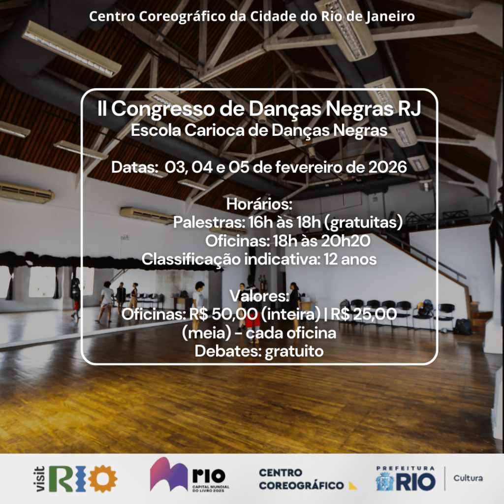 Fevereiro de 2026 no Centro Coreográfico da Cidade do Rio de Janeiro reúne uma programação diversa que articula formação, criação e difusão da dança. O mês conta com congressos, oficinas, espetáculos, ensaios abertos, mostras coreográficas e exposição educativa, contemplando Danças Negras, dança contemporânea, samba, culturas tradicionais, processos experimentais e ações formativas, reafirmando o CCo como espaço de encontro, reflexão e produção artística na cidade.