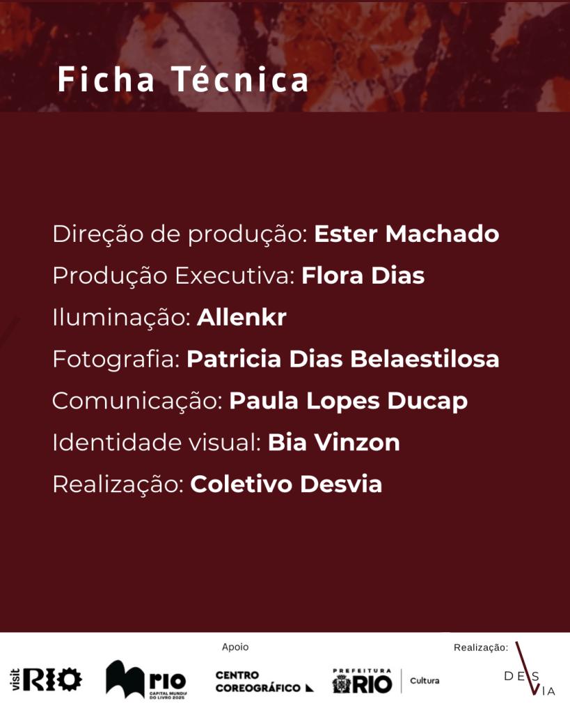 Histórico da cia: Desvia é um coletivo de artistas independentes do Rio de Janeiro, formado por Ester Machado, Flora Dias, Paula Lopes e Bia Vinzon, atuantes nas linguagens da dança contemporânea e da performance.