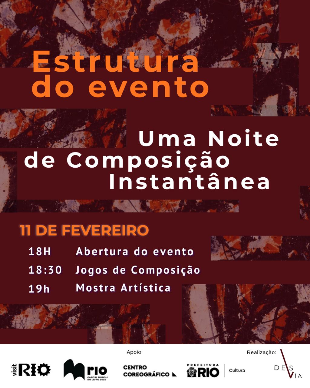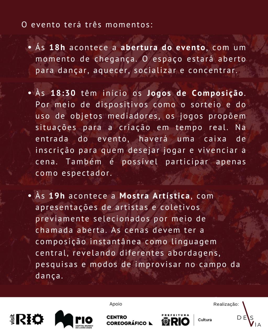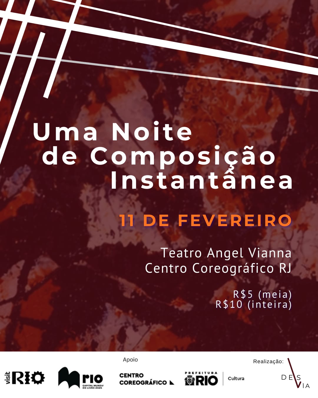 Resumo: DESVIA se constitui como um coletivo de dança contemporânea que tem a improvisação como prática coreográfica, propõe o projeto “Uma Noite de Composição Instantânea”, uma mostra dedicada à criação em tempo real e à experimentação das linguagens improvisadas.