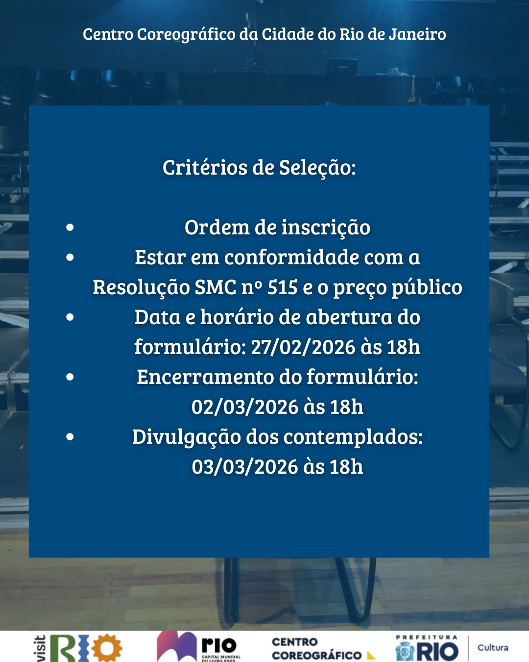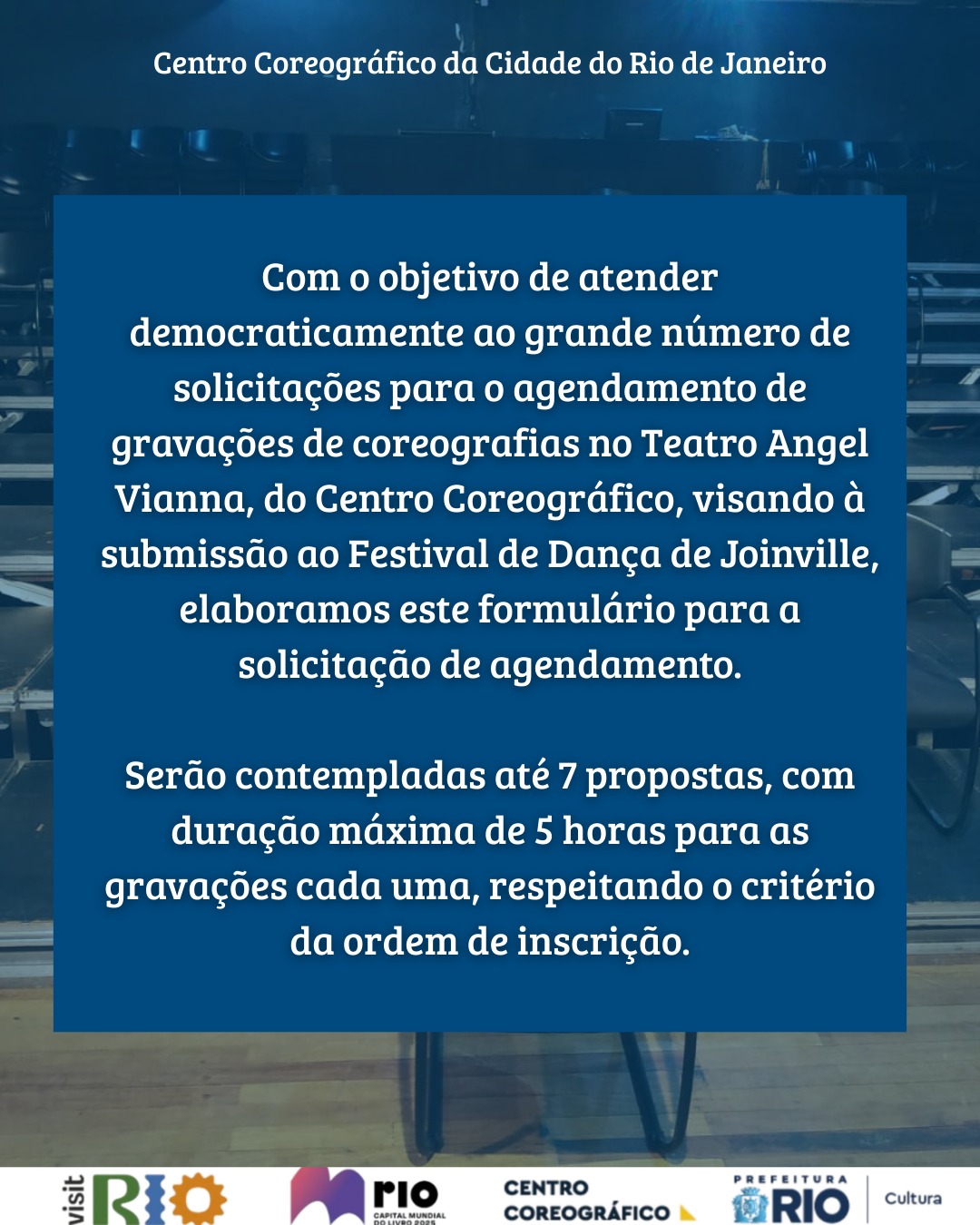 Com o objetivo de atender democraticamente ao grande número de solicitações para o agendamento de gravações de coreografias no Teatro Angel Vianna, do Centro Coreográfico, visando à submissão ao Festival de Dança de Joinville, elaboramos este formulário para a solicitação de agendamento.