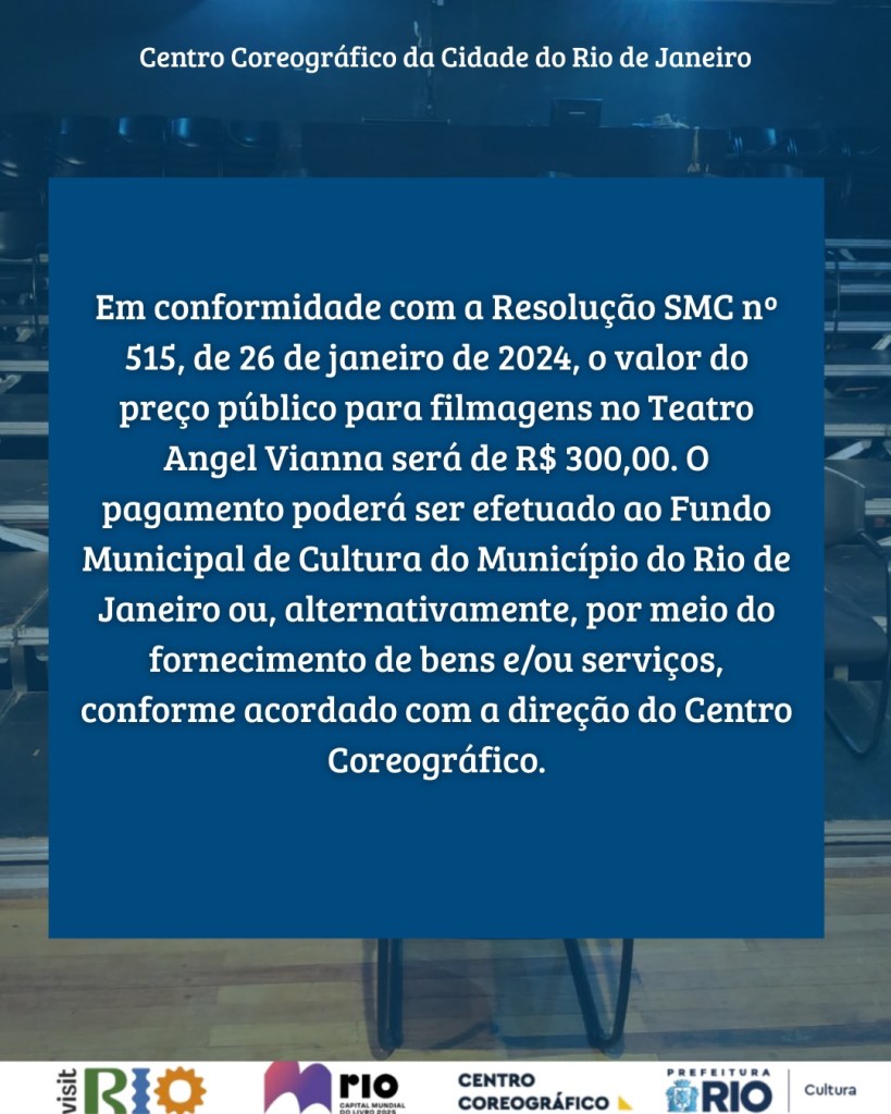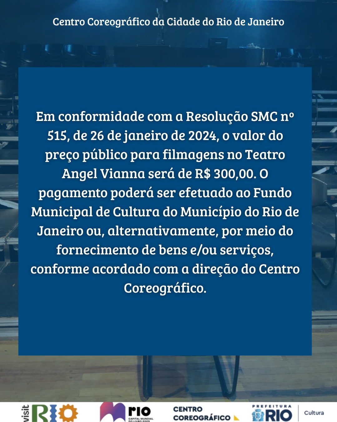 Em conformidade com a Resolução SMC nº 515, de 26 de janeiro de 2024, o valor do preço público para filmagens no Teatro Angel Vianna será de R$ 300,00. O pagamento poderá ser efetuado ao Fundo Municipal de Cultura do Município do Rio de Janeiro ou, alternativamente, por meio do fornecimento de bens e/ou serviços, conforme acordado com a direção do Centro Coreográfico.