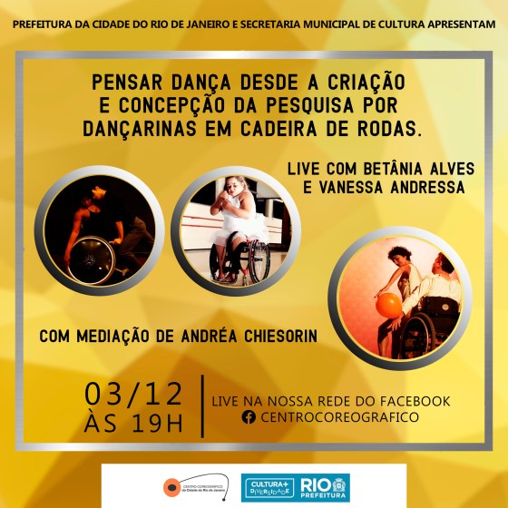 #PraCegoVer #PraTodosVerem #DescreviPraVocê: card em cor amarela, com grafias amareladas em sobretons. No topo, escrita em letras maíusculas e pretas, “PREFEITURA DA CIDADE DO RIO DE JANEIRO E SECRETARIA MUNICIPAL DE CULTUTA APRESENTAM”. Logo abaixo, uma borda prateada que emoldura as informações. Na parte superior, ao centro, “PENSAR DANÇA DESDE A CRIAÇÃO E A CONCEPÇÃO DA PESQUISA POR DANCARINAS EM CADEIRAS DE RODAS”. Abaixo, três imagens em círculo também emolduradas em prata apresentam as participantes. Na primeira imagem à esquerda, Betânia sentada na cadeira, movendo o corpo em lateralidade, inclinado-se em direção às rodas. Compõe uma relação com o bailarino, que se apoia nas estruturas da cadeira, formando uma cena em duo que se revela de perfil, e com figurino preto. Ao lado, também emoldurada com círculo prata, na segunda imagem, Vanessa sentada na cadeira, movimentando-se pela articulação do tronco, no mover dos braços que se relacionam num encontro das mãos. Encontra-se frontalmente em um solo, e seu figurino é branco. À direita dela, o texto em letras pretas “LIVE COM BETÂNEA ALVES E VANESSA ANDRESSA” – na linha de baixo do card o texto “COM MEDIAÇÃO DE ANDRÉA CHIESORIN” e a terceira imagem, ao lado direito, emoldurada com um círculo prata, Andréa e Rogério, sentada nas pernas do bailarino na cadeira, apoiando seus pés no chão, com os seus corpos sobrepostos, movem-se ambos com os braços esquerdos e entre eles uma bola de ar, laranja. Os corpos estão em diagonal e de perfil, ambos com figurino claro. Abaixo, as informações 03/12 ÀS 19H | LIVE NA REDE DO FACEBOOK DO CENTRO COREOGRÁFICO (facebook.com/centrocoreografico). Na última linha do card, os logotipos dos realizadores, Centro Coreográfico da Cidade do Rio de Janeiro e Prefeitura do Rio, CULTURA+ DIVERSIDADE centralizado. Fim da descrição.