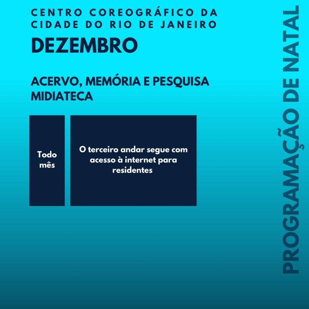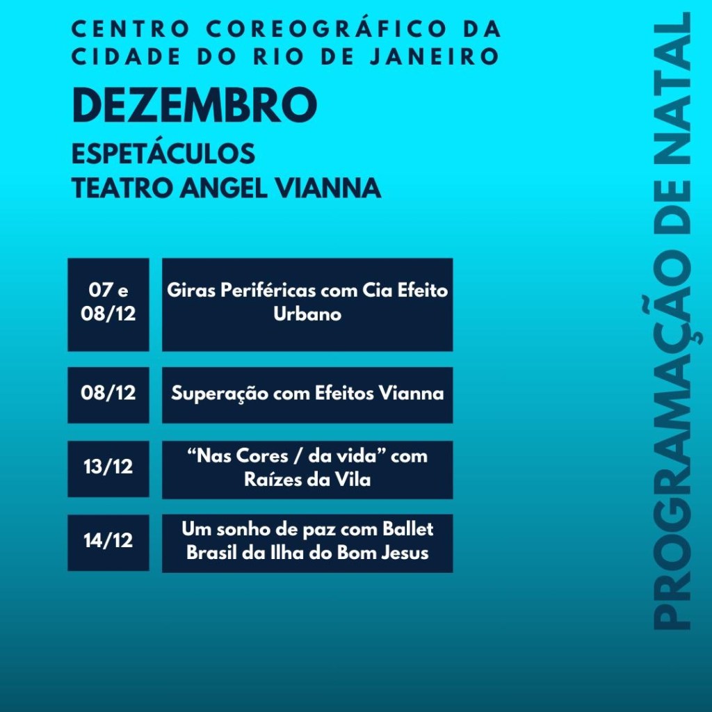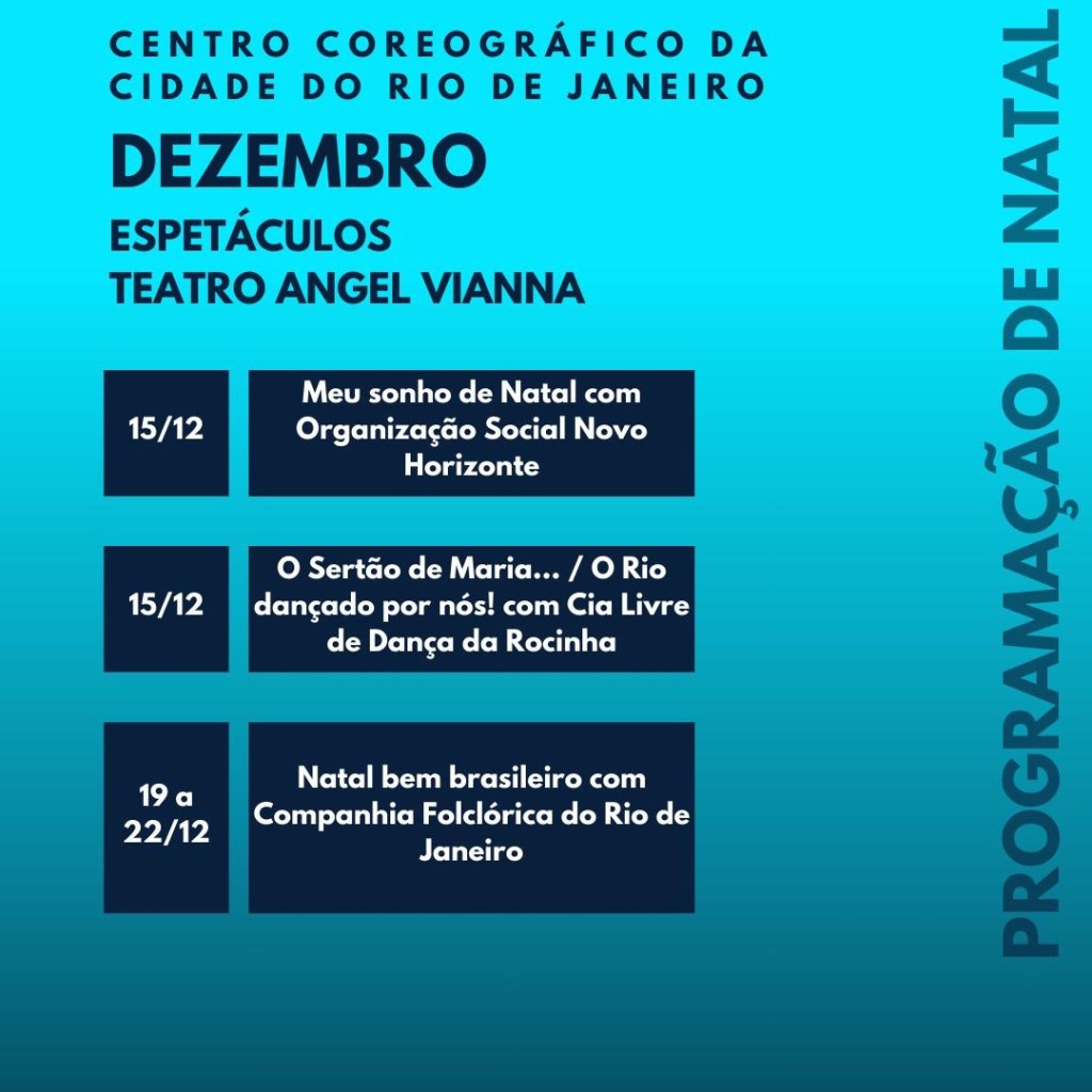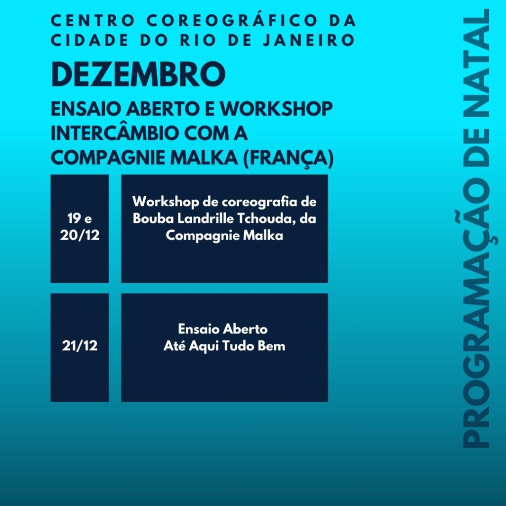 Venha celebrar a dança no Centro Coreográfico em dezembro! Nossa programação inclui espetáculos vibrantes de projetos sociais e companhias das favelas das AP 1 e 2, destacando talentos locais. Participe de oficinas diversas, com foco em acessibilidade cultural, e explore intercâmbios internacionais, como a presença da renomada Companhia Malka, da França, direto da Bienal de Lyon. Para encerrar o mês, a Cia Folclórica do Rio de Janeiro traz uma celebração das nossas raízes culturais. Não perca essa oportunidade de vivenciar arte e diversidade!