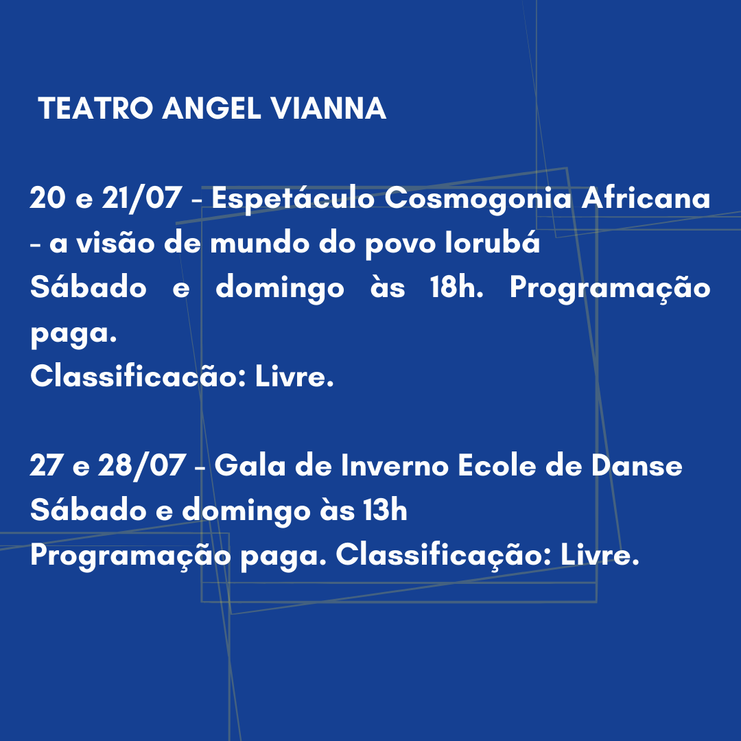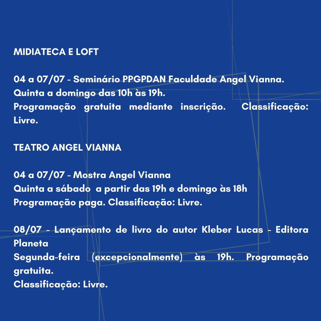 Informações: A Mostra Angel Vianna é um evento interno da Escola e Faculdade Angel Vianna que acontece duas vezes ao ano e reúne as produções criadas e desenvolvidas pelos alunos da instituição, inscritos em: Cursos Livres; Escola Técnica; Graduação (Licenciatura e Bacharelado); Pós-Graduação (Lato Sensu e Stricto Sensu).