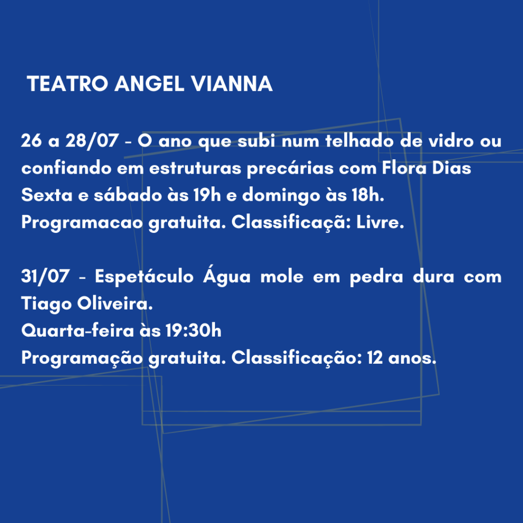 Histórico da cia: A Mostra Angel Vianna reúne produções desenvolvidas pelos alunos dos cursos livres, técnico, graduação e pós-graduação da Angel Vianna Escola e Faculdade de Dança: performances, coreografias, instalações, videodança e outras formas de criação artística. Há várias décadas uma referência em preparação corporal e estudos do movimento, Angel Vianna elaborou e concretizou uma pedagogia do corpo, contribuindo para o treinamento de atores e bailarinos, e para o desenvolvimento da cultura em todo o país.