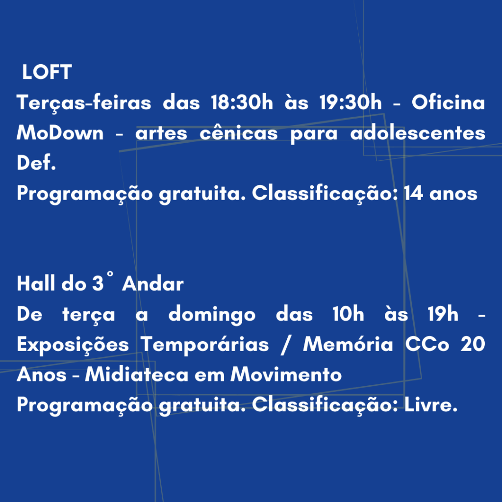 Local: Midiateca do Centro Coreográfico da Cidade do Rio de Janeiro – R. José Higino, 115 – Tijuca, Rio de Janeiro – RJ, 20510-430
